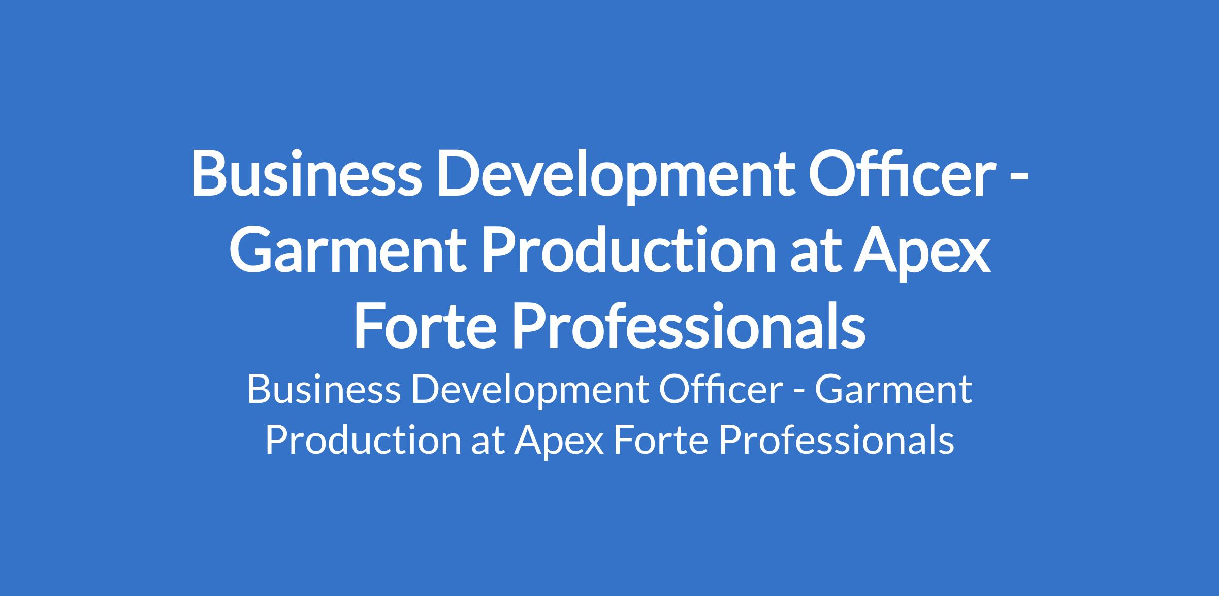Apex Forte Professionals is recruiting to fill the position of: Business Development Officer - Garment Production. The position is located in Ilasa Maja, Oshodi Expressway - Lagos State. Interested candidates should possess a Bachelors Degree in Business Administration, Accounting, or a related field with minimum of 5 years of relevant experience in Business Development, Sale, operations, or Marketing (preferably in a manufacturing setting).