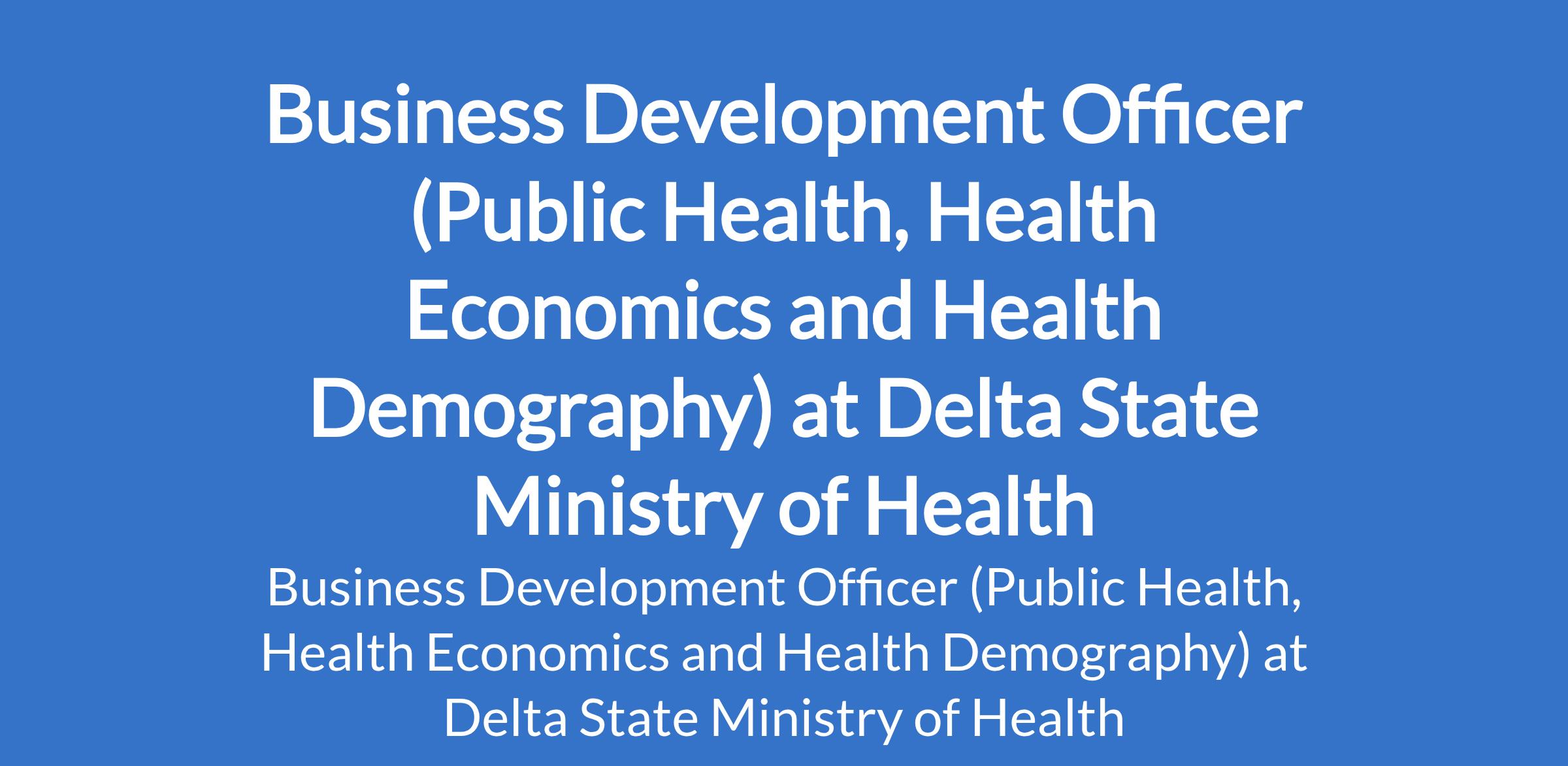 Delta State Ministry of Health is inviting applications from suitable candidates to fill the position of: Business Development Officer (Public Health, Health Economics and Health Demography). Interested candidates should possess a Degree in Public Health, Health Economics, Health Demography and other related fields.