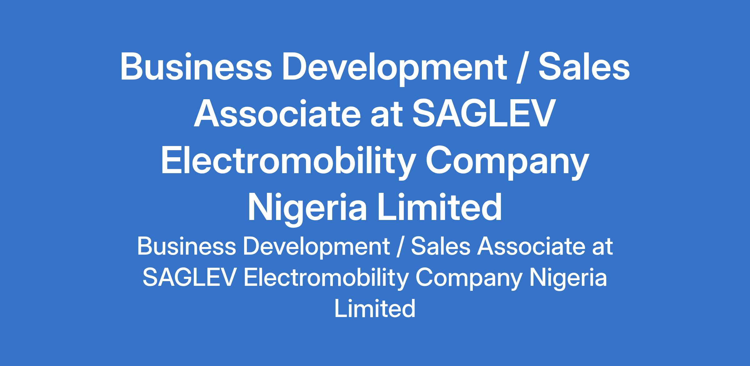 SAGLEV Electromobility Company Nigeria Limited is recruiting to fill the position of: Business Development / Sales Associate. The position is located in Victoria Island, Lagos State. Interested candidates should possess a Bachelors Degree in Marketing or a related discipline with a minimum of 3 years of proven experience in sales or business development, must be resident in Lagos and available to resume immediately.