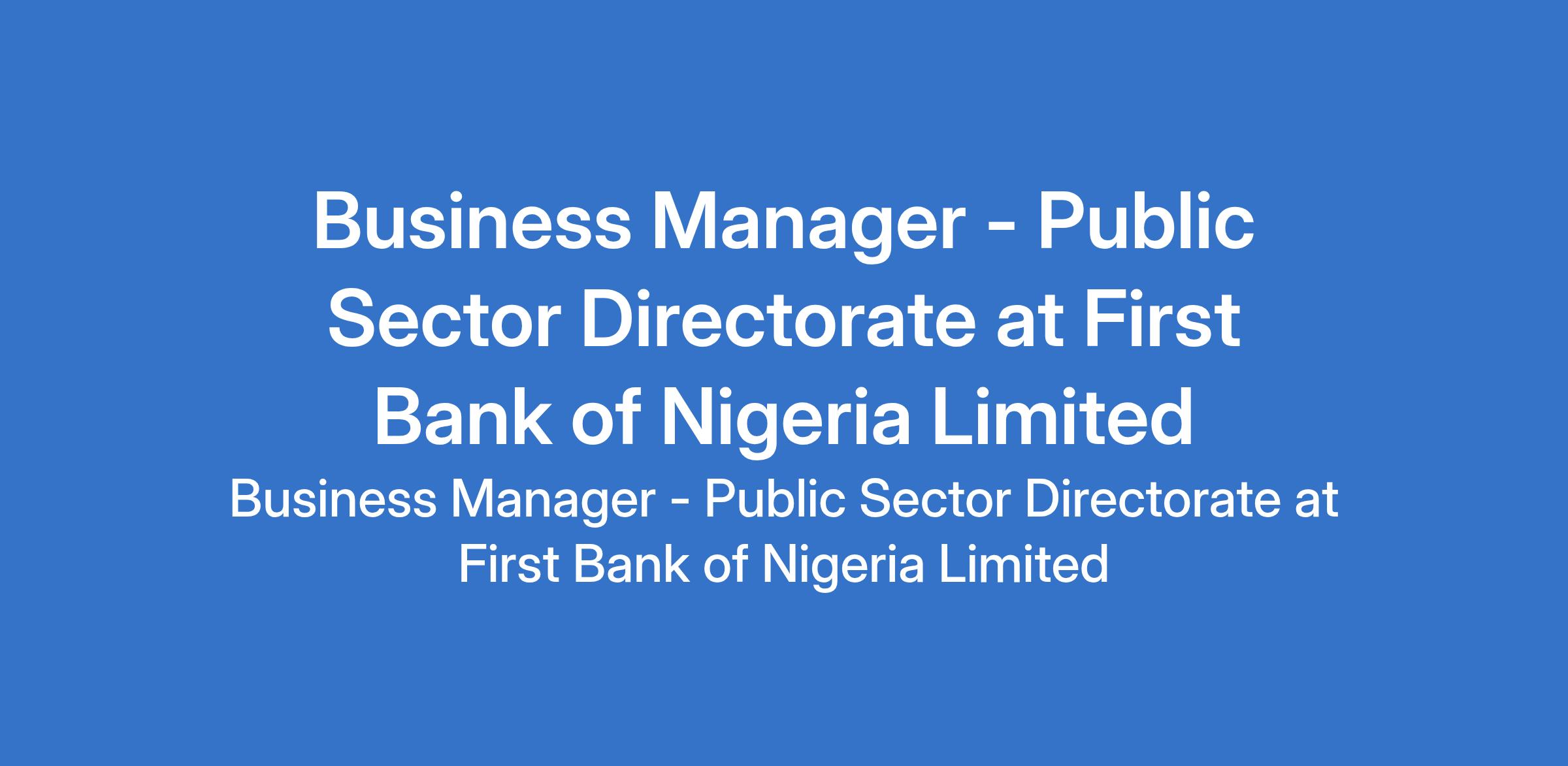 First Bank of Nigeria Limited is recruiting to fill the position of: Business Manager - Public Sector Directorate. The position is located in Ekiti States. Interested candidates should possess a First Degree with 10 years relevant banking (marketing/business development) experience, with significant exposure to Public Sector customers and key stakeholders.