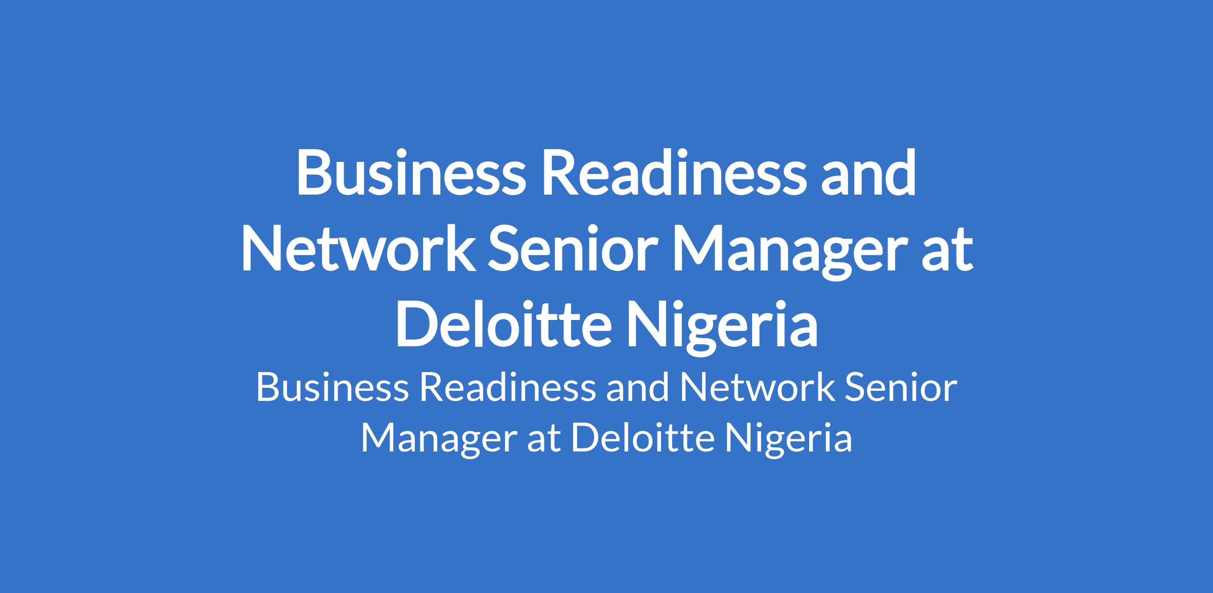 Deloitte Nigeria is recruiting to fill the position of: Business Readiness and Network Senior Manager. The position is located in Lagos-Calabar Coastal Road, Victoria Island - Lagos State. Interested candidates should possess a Bachelors Degree in Business, Industrial Psychology, or related field with 7+ years in change readiness, transformation delivery, PMO, or business operations leadership.