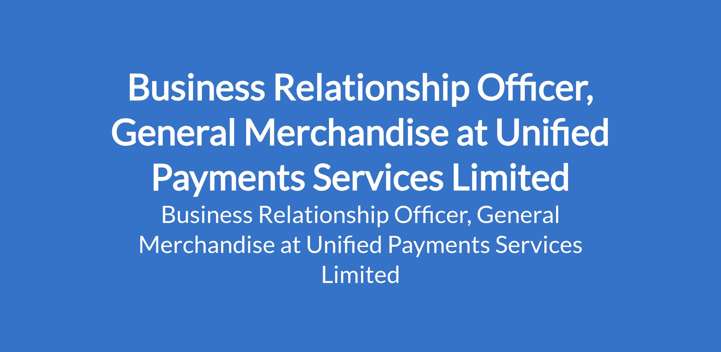 Unified Payments Services Limited is recruiting to fill the position of: Business Relationship Officer, General Merchandise. The position is located in Lagos State. Interested candidates should possess a Bachelors Degree in Business Administration, Marketing, Economics, or a related field.