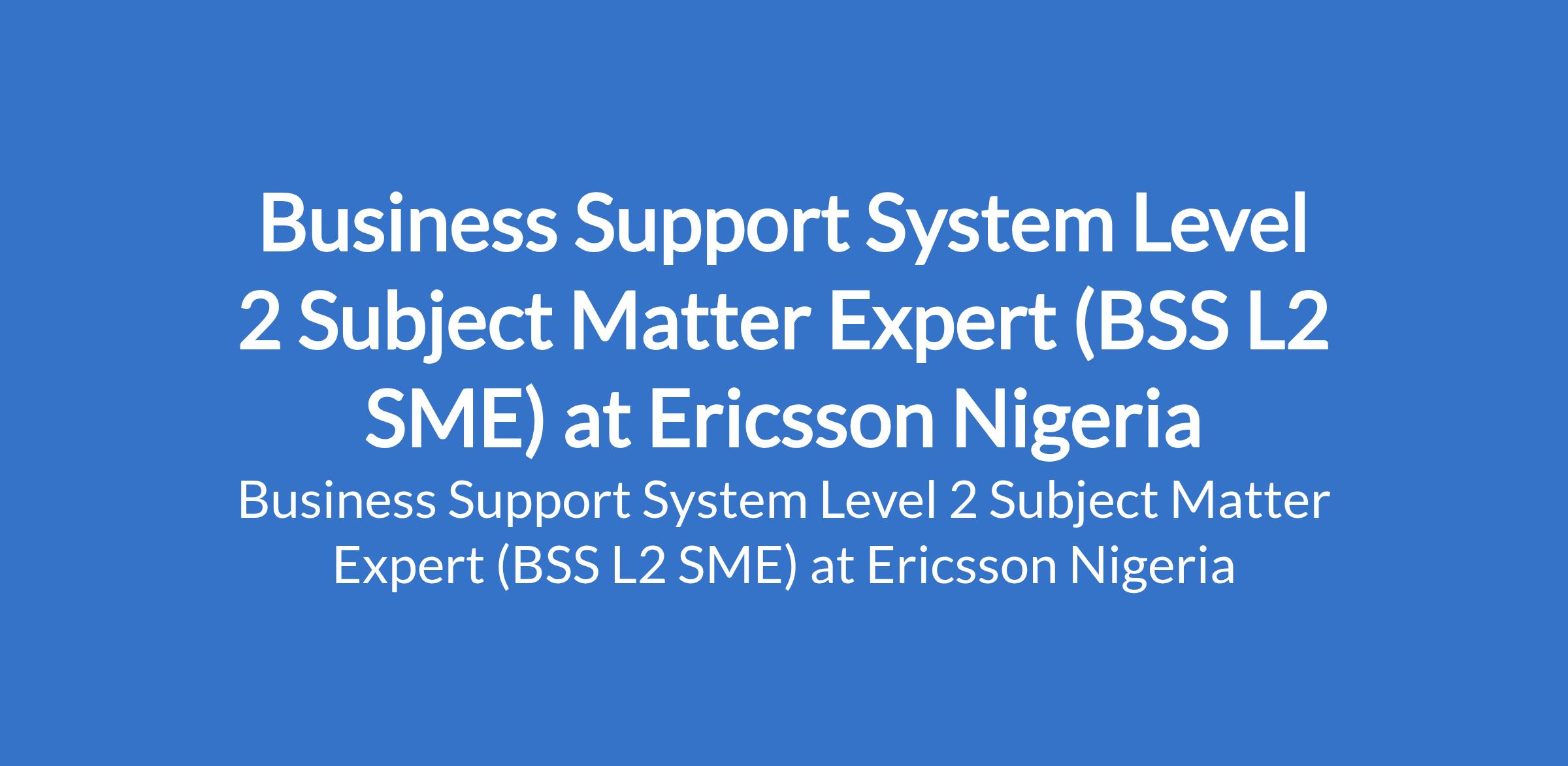 Ericsson Nigeria is recruiting to fill the position of: Business Support System Level 2 Subject Matter Expert (BSS L2 SME). The position is located in Lagos State. Interested candidates should possess a BSc Degree in Telecommunications, Computer Science or equivalent with 8+ years of experience in Telecom BSS and NetCracker Convergent Rating & Billing.