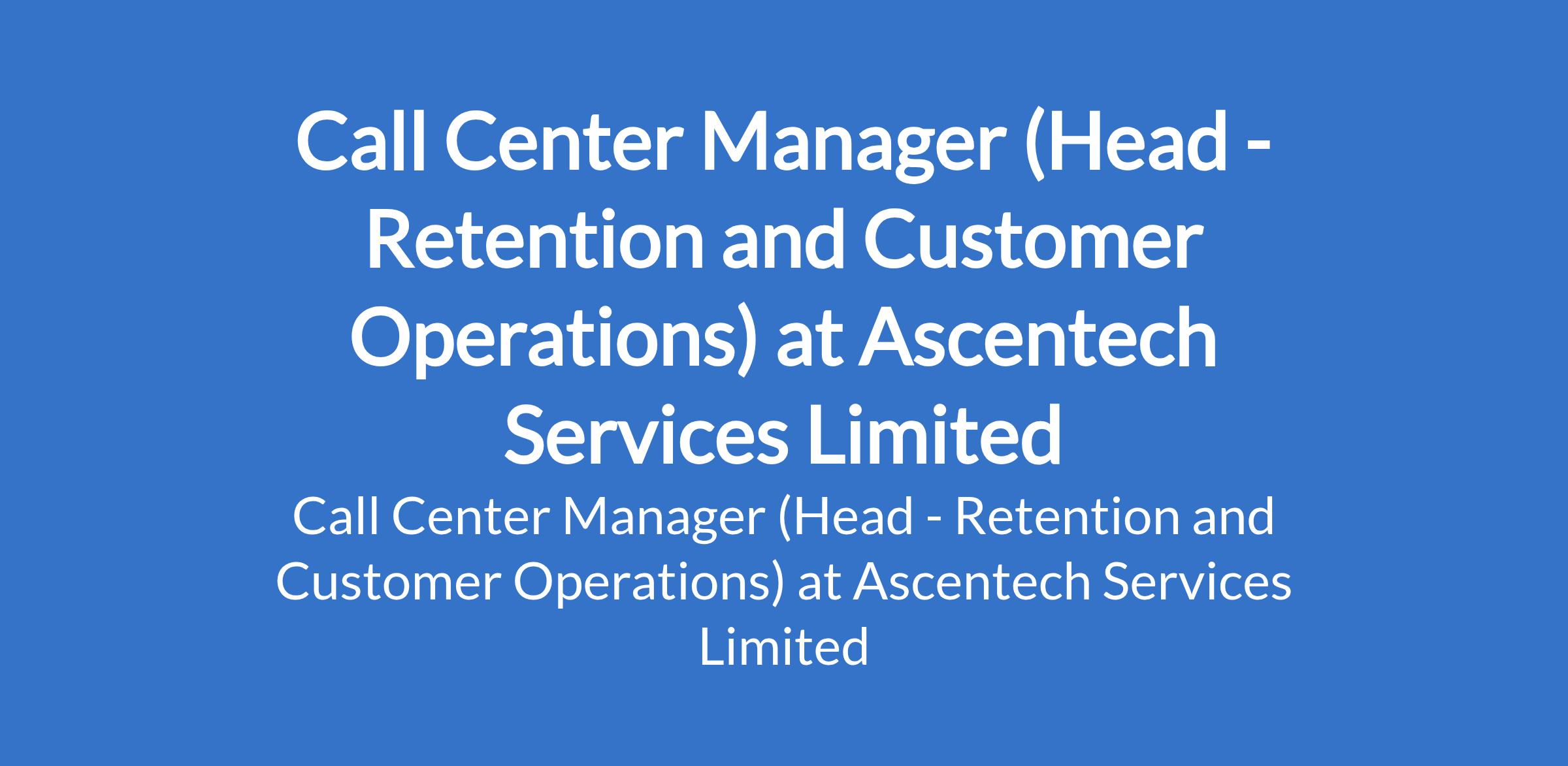 Ascentech Services Limited is recruiting to fill the position of: Call Center Manager (Head- Retention and Customer Operation). The position is located in Ikeja Lagos State. Salary: N500,000 per month. Interested candidates should possess relevant qualifications with 5 8 years experience in call center or customer operations, with leadership responsibility.