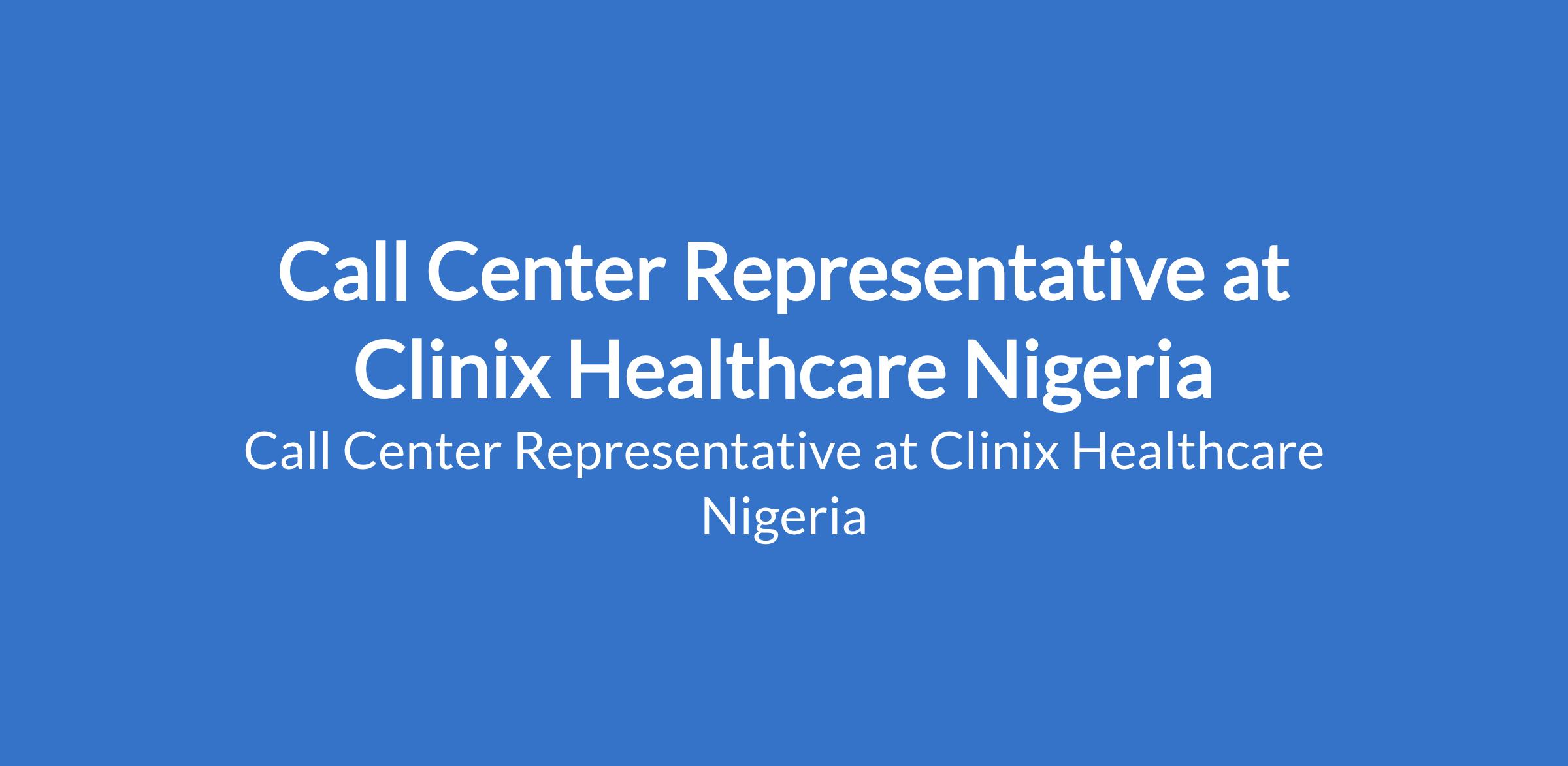 Clinix Healthcare Nigeria is recruiting to fill the position of: Call Center Representative. The position is located in Lagos State. Interested candidates should possess a minimum of OND / HND / Bachelors Degree in any relevant field with 12 years experience.