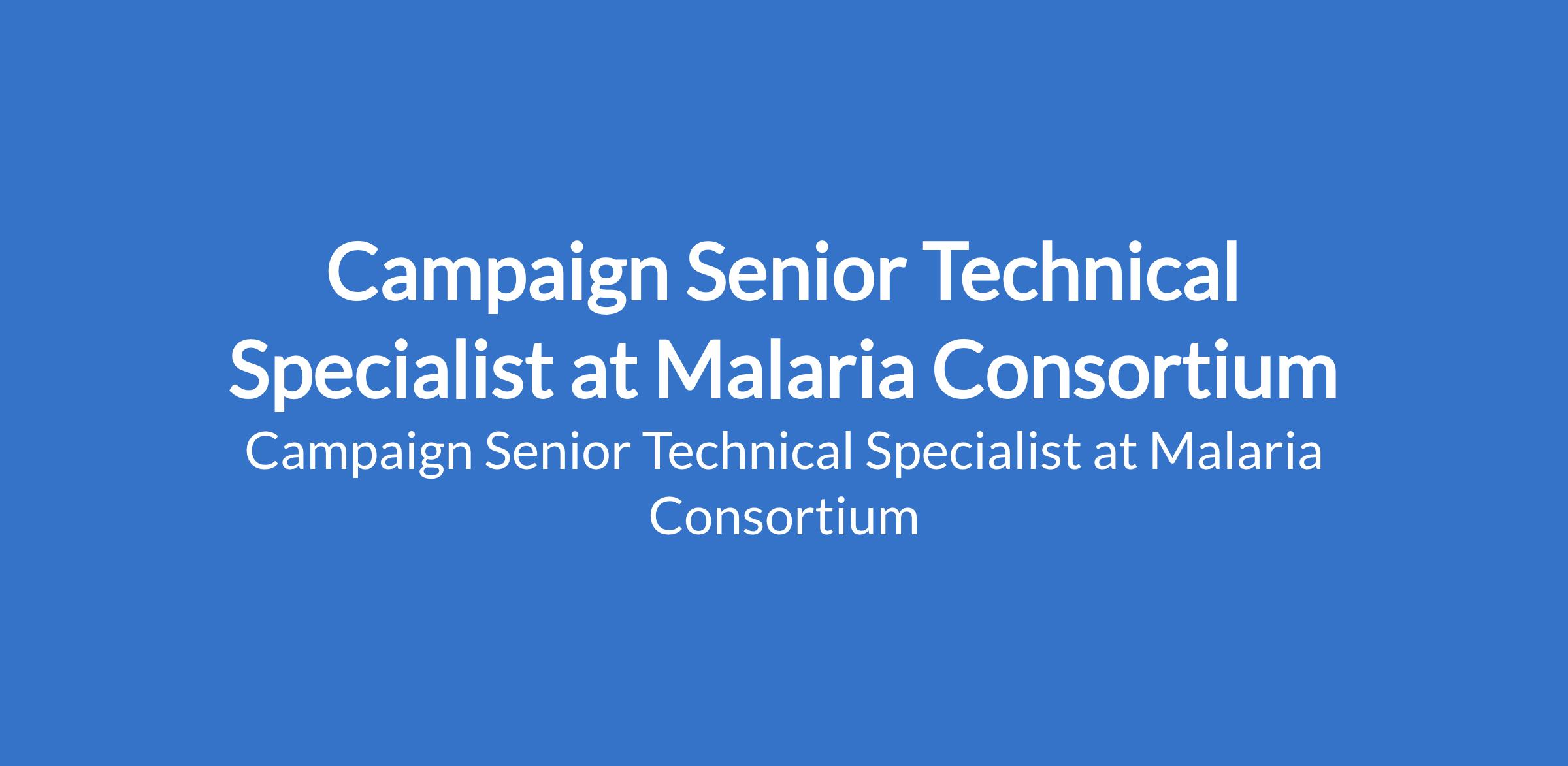 Malaria Consortium is recruiting to fill the position of: Campaign Senior Technical Specialist. The position is located in Abuja. Interested candidates should possess an Advanced Degree in Public Health, Epidemiology, Health Informatics, Data Science or a related field with 5-7 years experience in malaria programming or large-scale public health campaigns.