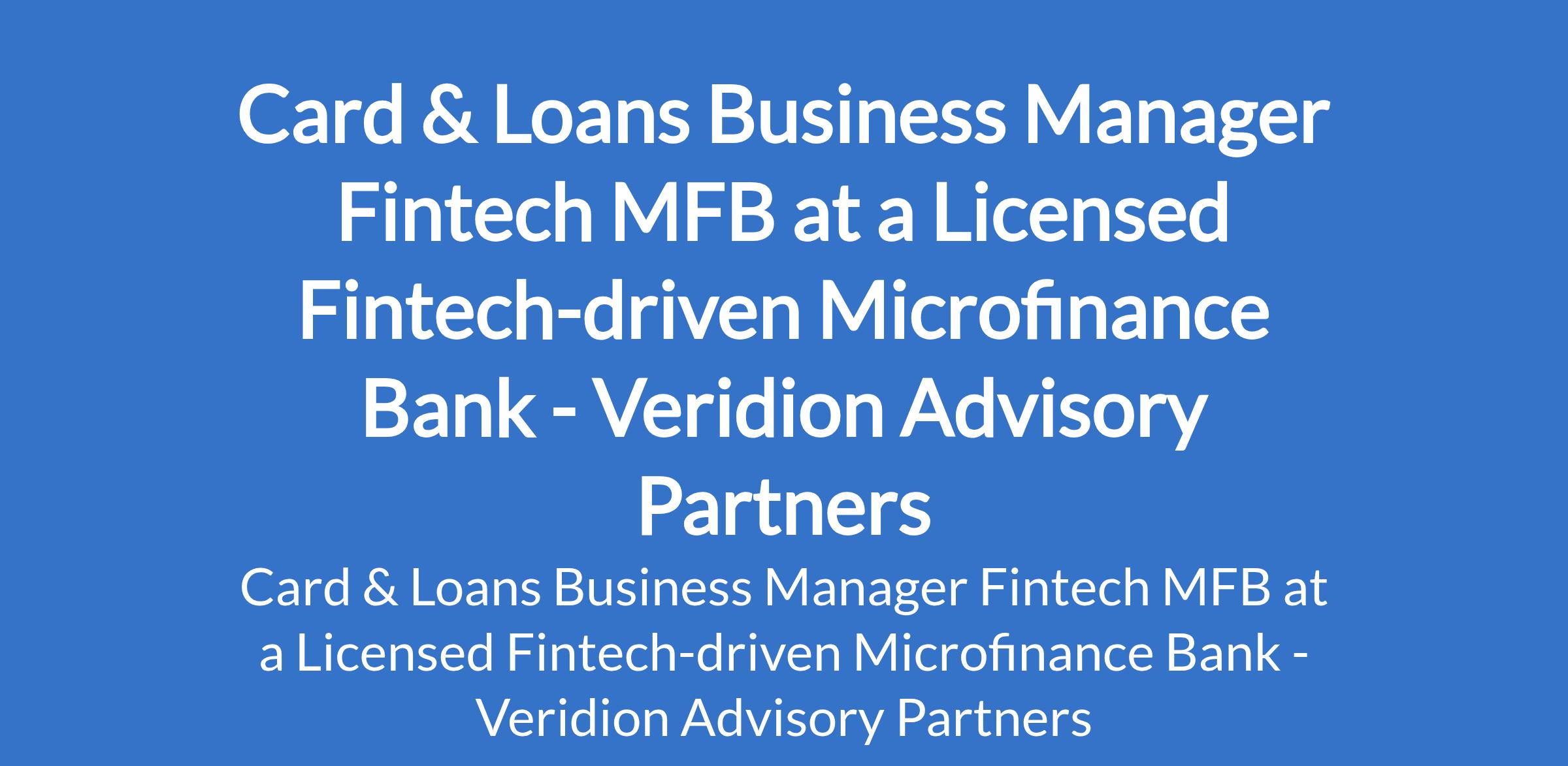 Veridion Advisory Partners - Our client, a licensed fintech-driven microfinance bank is recruiting to fill the position of: Card & Loans Business Manager Fintech MFB. The position is located in Lagos State. Interested candidates should possess a Bachelors Degree in Finance, Accounting, Economics, Business Administration, or related fields with 8+ years experience in cards, loans, retail, or SME lending business management, preferably in a bank, microfinance, or fintech environment.