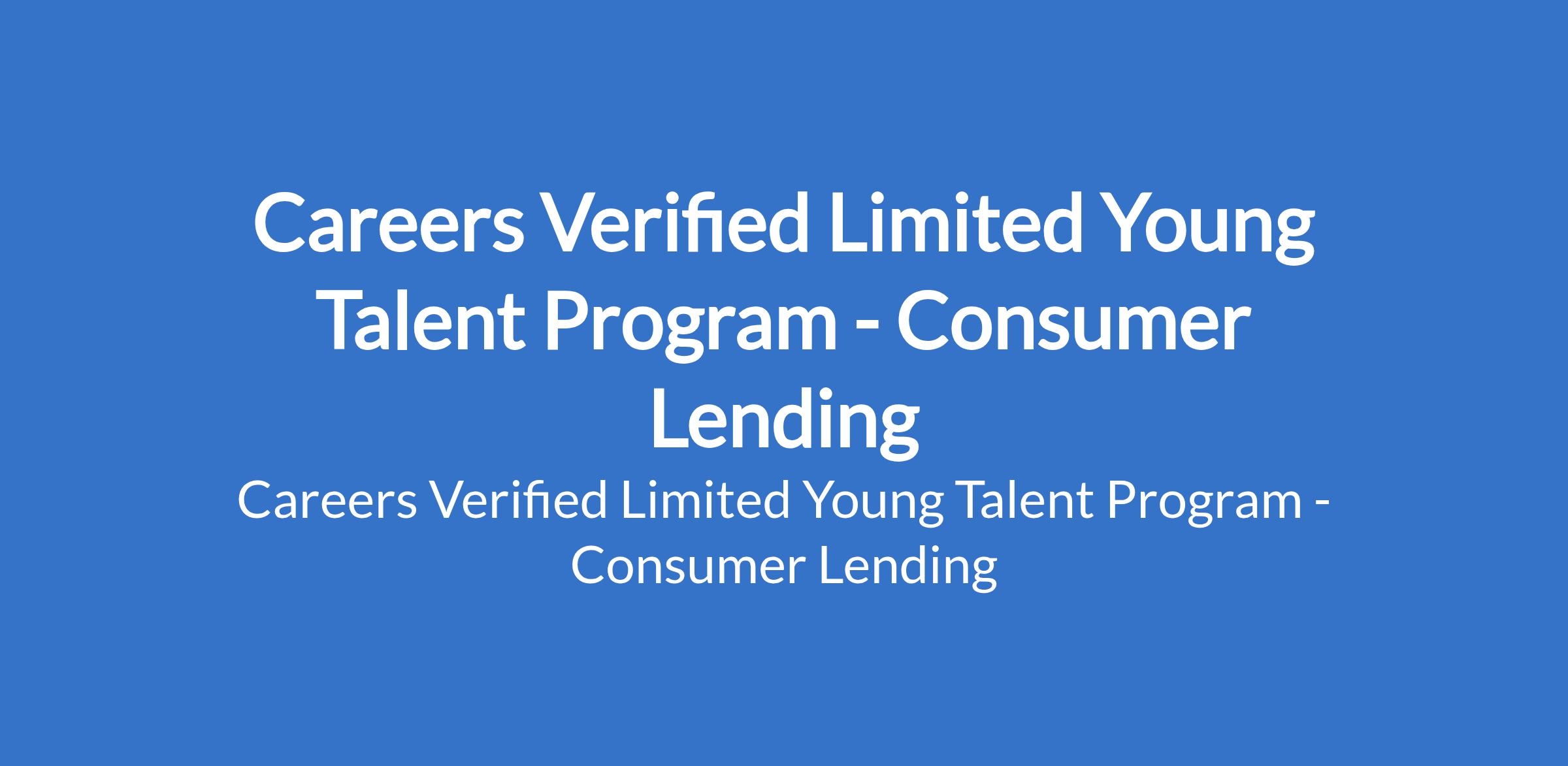 Careers Verified Limited invites applications from suitable candidates for its Young Talent Program - Consumer Lending. The Program is designed to attract, develop, and groom high-potential graduates into future Consumer Lending professionals. Interested candidates should possess a Bachelors Degree in Finance, Economics, Business Administration, Accounting, or related field with 0 2 years experience (NYSC members may apply).