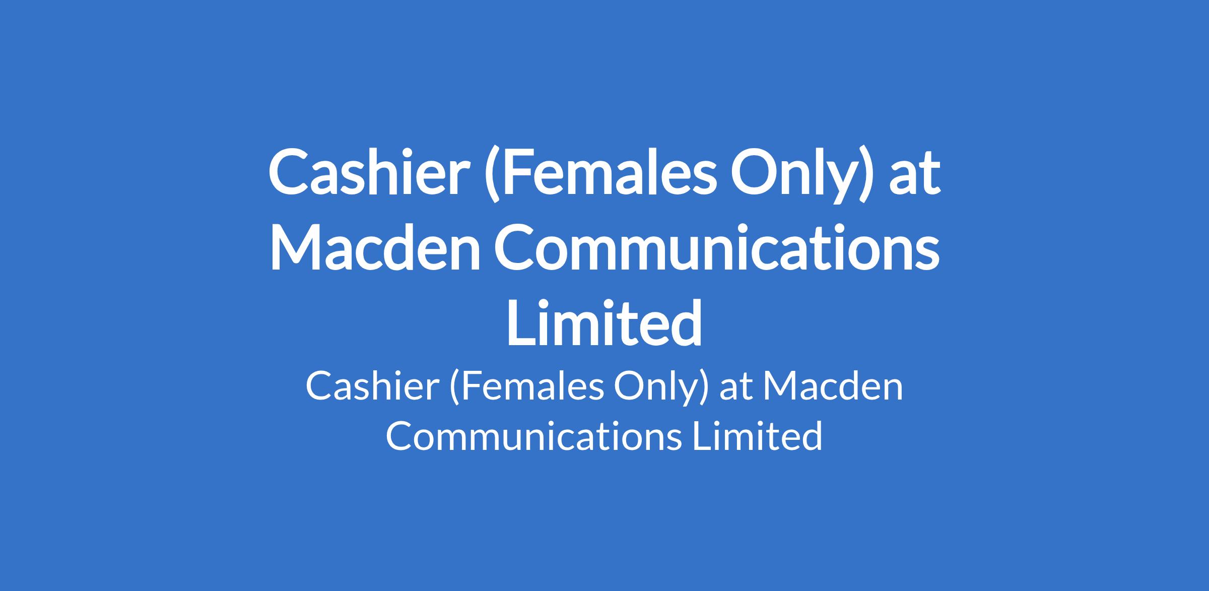 Macden Communications Limited is recruiting to fill the position of: Cashier (Females Only). The position is located in Nnobi, Anambra State. Salary: N65,000 - N70,000 / month. Interested candidates should possess a relevant qualification and must reside within Nnobi Local Government Area only.