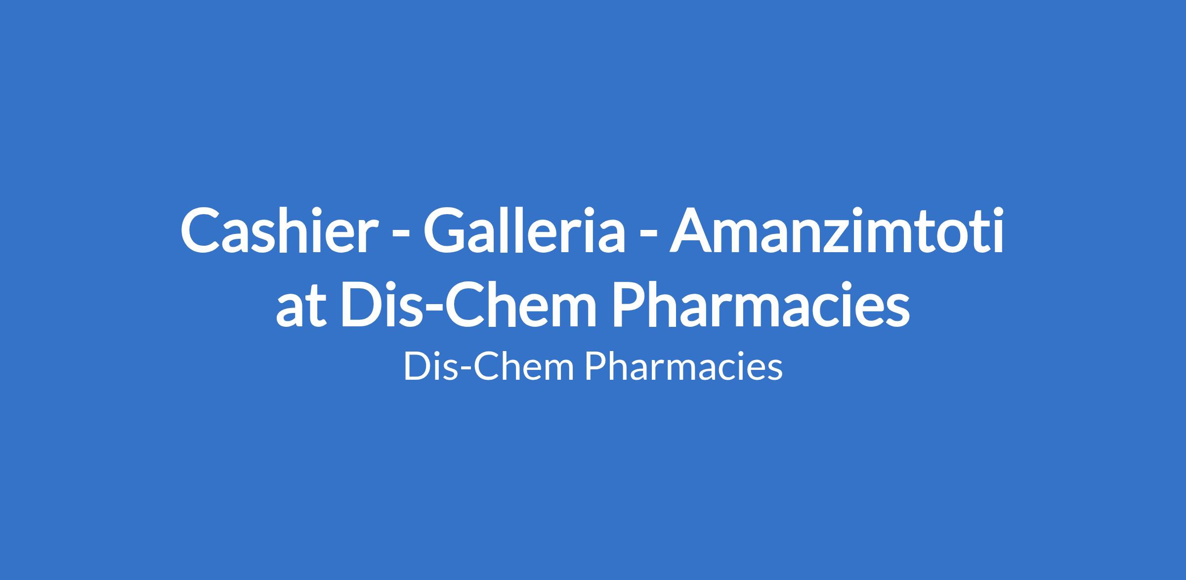 Dis-Chem Pharmacies requires an experienced Cashier for their Galleria - Amanzimtoti store. Support customer service at point of sale while ensuring a world-class shopping experience.