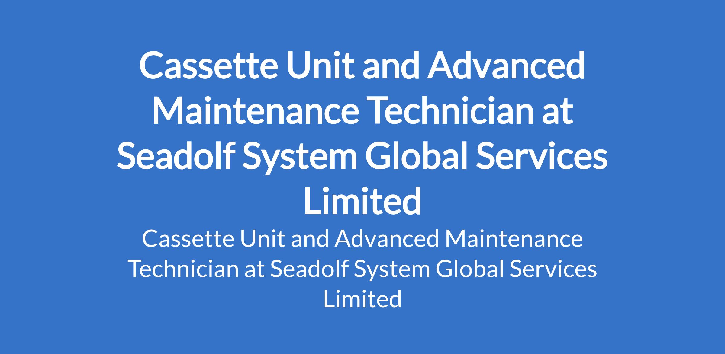 Seadolf System Global Services Limited is recruiting to fill the position of: Cassette Unit and Advanced Maintenance Technician. The position is located in Oshodi / Isolo, Lagos State. Salary: N150,000 monthly. Interested candidates should possess a relevant qualification with 2 - 5 years experience.