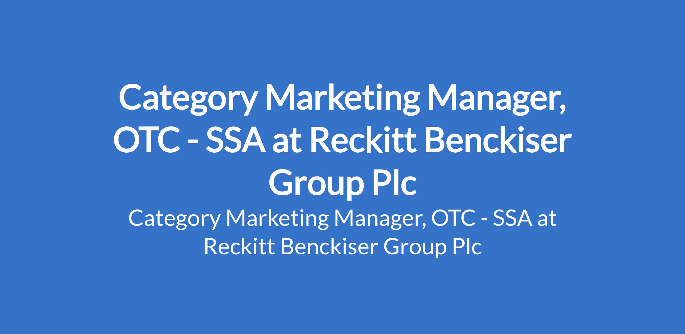 Reckitt Benckiser Group Plc is recruiting to fill the position of: Category Marketing Manager, OTC - SSA. The position is located in Lagos Island, Lagos State. Interested candidates should possess a First Degree in Pharmacy, Biological Sciences, or Social Sciences with 8 - 10 years of marketing experience, and must be able to demonstrate outstanding marketing skills developed within the Pharma/FMCG environment.