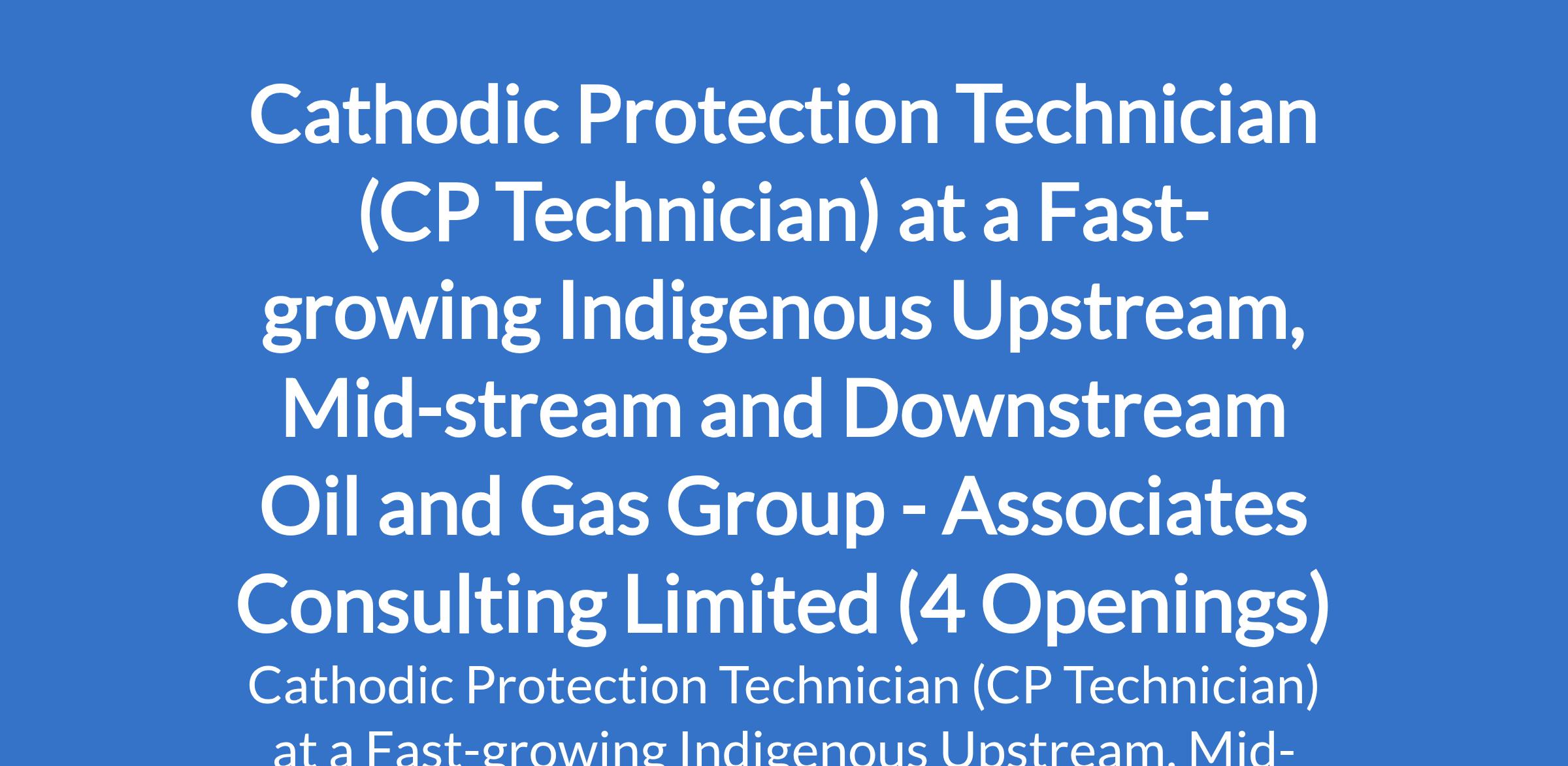 Associates Consulting Limited - Our client is a fast-growing indigenous upstream, mid-stream and downstream oil and gas group is recruiting to fill the position of: Cathodic Protection Technician (CP Technician). The position is located in Akwa Ibom, Delta, Imo, and Rivers States. Interested candidates should possess a Diploma or an HND / Degree in any course with a minimum of 10 years experience in Cathodic Protection systems for a pipeline project.