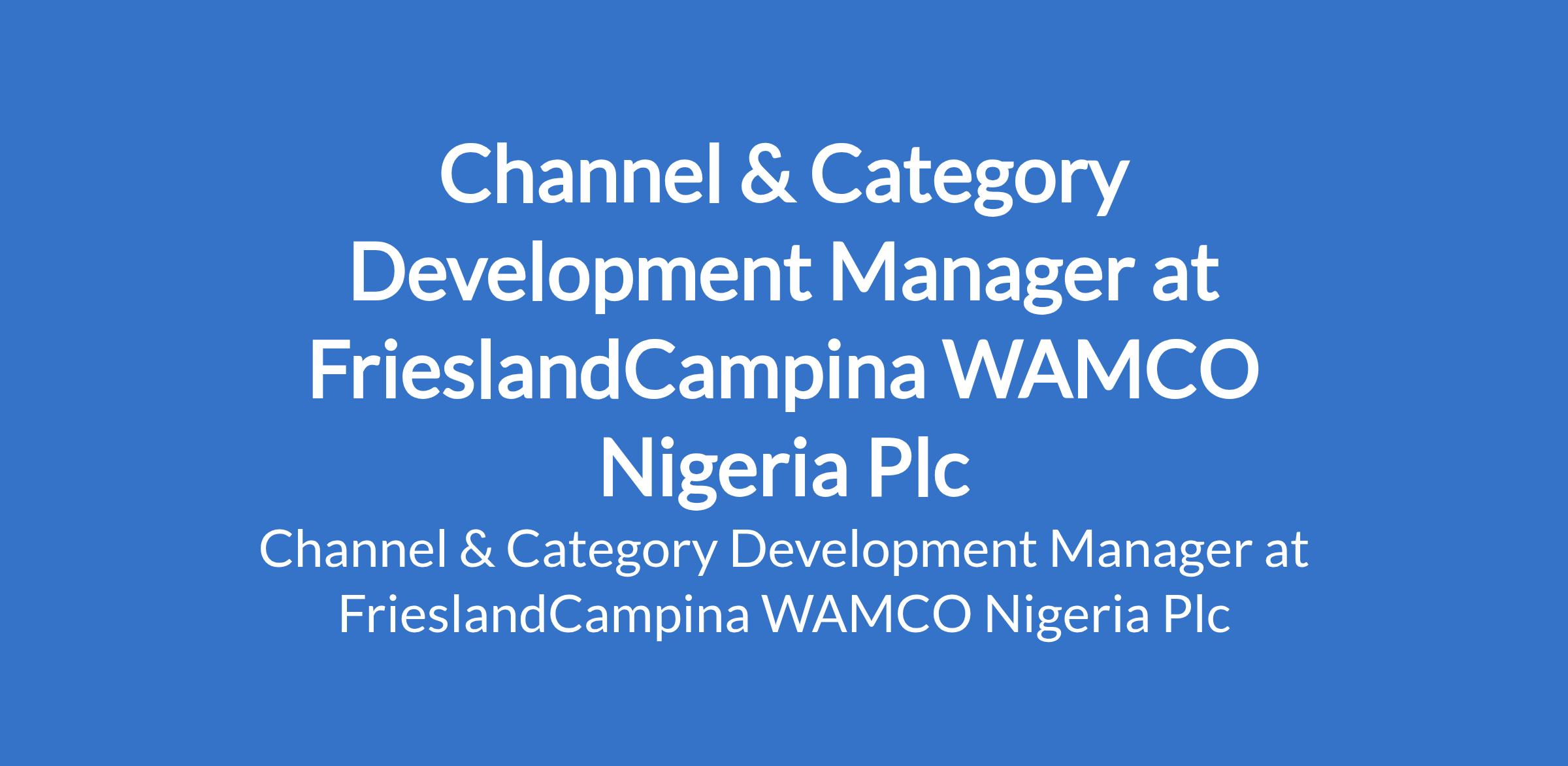 FrieslandCampina WAMCO Nigeria Plc is recruiting to fill the position of: Channel & Category Development Manager. Interested candidates should possess a Bachelors Degree in any discipline with a minimum of 7 years of experience in Sales, Shopper Marketing, or Trade Marketing; at least 2 years in a Sales managerial role, and a minimum of 2 years of field sales experience.