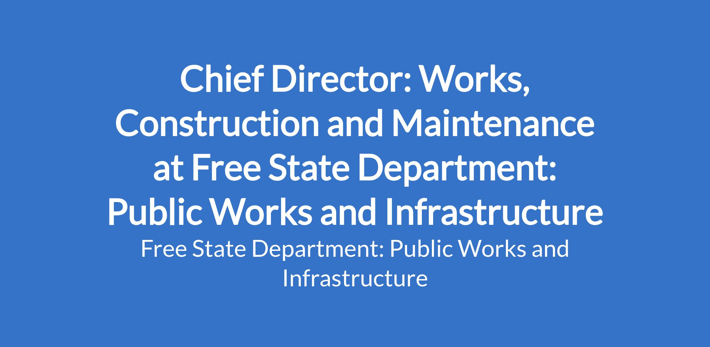 Lead and oversee the Chief Directorate to ensure that strategic objectives are achieved in terms of the governing legal framework, good corporate governance, compliance with the Infrastructure Delivery Management System (IDMS) and within available financial resources in terms of PFMA. Provide strategic management and leadership for the infrastructure and maintenance plans for the Free State Province implemented by works regional offices in the districts of Motheo/Xhariep / Thabo Mofutsanyane / Fezile Dabi and Lejweleputswa for departmental infrastructure and that of sector clients. Oversee the management, development and review of the Chief Directorate infrastructure delivery plan and maintenance strategy as and when required to enhance infrastructure delivery and to mitigate risk.