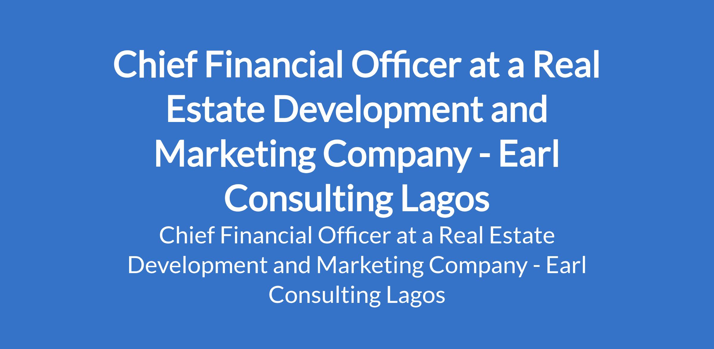 Earl Consulting Lagos - Our client, a Real Estate Development and Marketing company is recruiting to fill the position of: Chief Financial Officer. The position is located in Victoria Island, Lagos State. Interested candidates should possess a Bachelors Degree or Master's Degree in Finance, Accounting, Business Administration, or a related field with 5 - 9 years of proven experience as a chief financial officer or senior finance leadership role within a multi-industry or real estate environment.