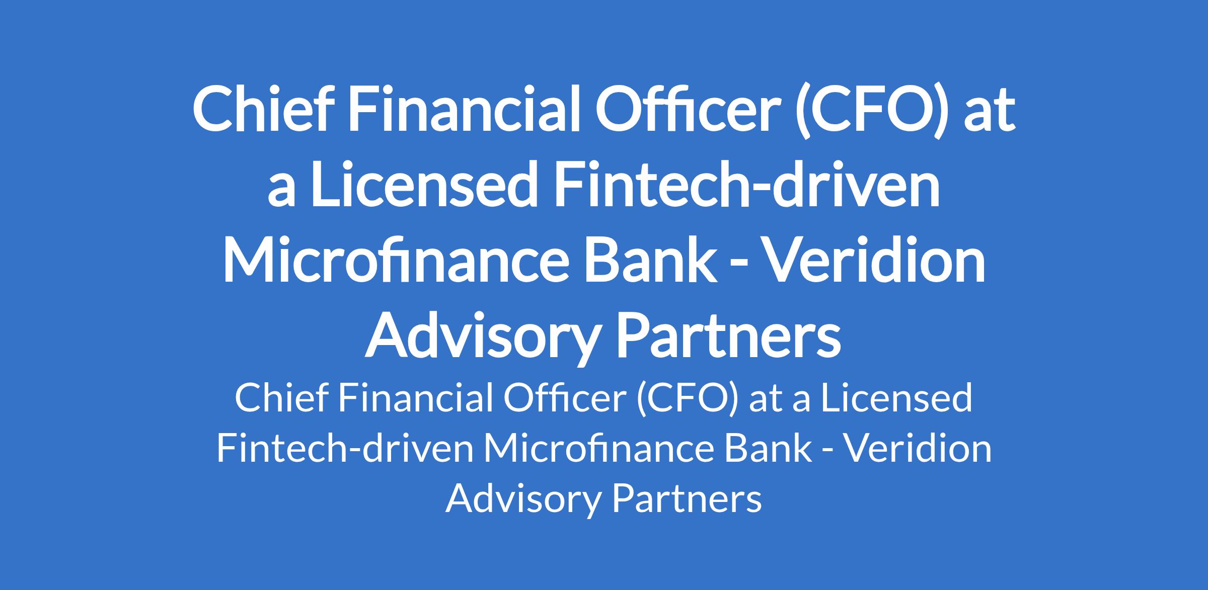 Veridion Advisory Partners Our client, a licensed Fintech-driven Microfinance bank is recruiting to fill the position of: Chief Financial Officer (CFO). The position is located in Lagos State. Interested candidates should possess a Bachelors Degree in Accounting, Finance, Economics, or related disciplines; a professional certification (ACA, ACCA, CPA, or CFA) with a minimum of 12 years progressive finance experience within banking, fintech, or financial services firms.