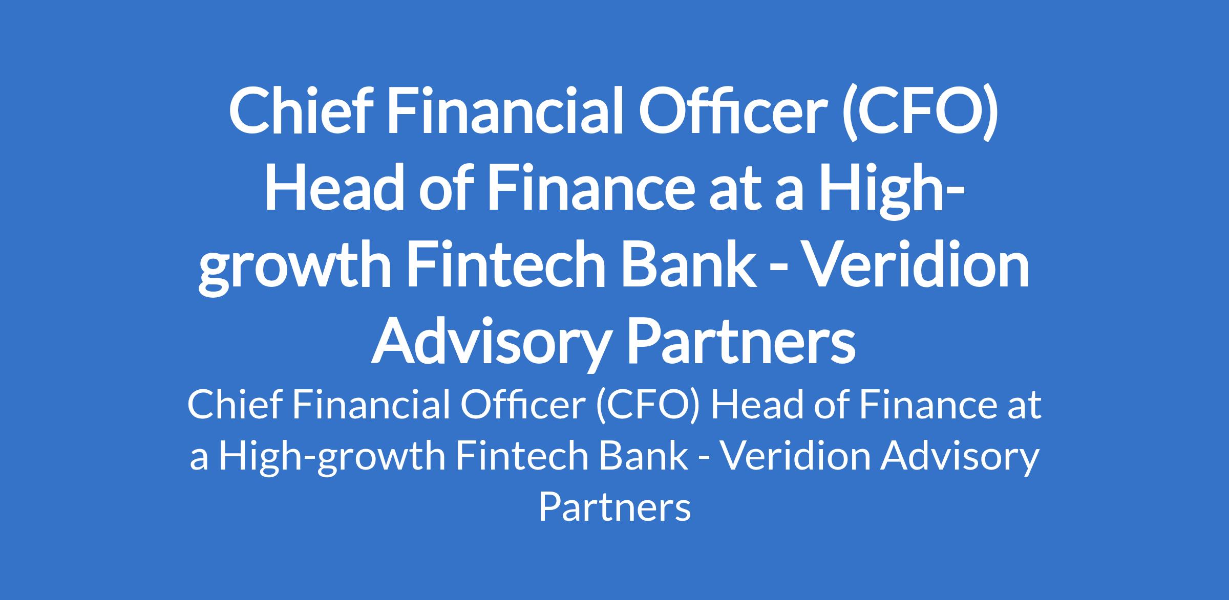 Veridion Advisory Partners Our client, a High-growth Fintech Bank is recruiting to fill the position of: Chief Financial Officer (CFO) Head of Finance. The position is located in Lagos State. Interested candidates should possess a Bachelor's Degree in Accounting, Finance, Economics, or related disciplines; MBA or equivalent postgraduate qualification preferred with a minimum of 12 years progressive financial leadership experience, with exposure to fintech banking, commercial banking, or financial services.