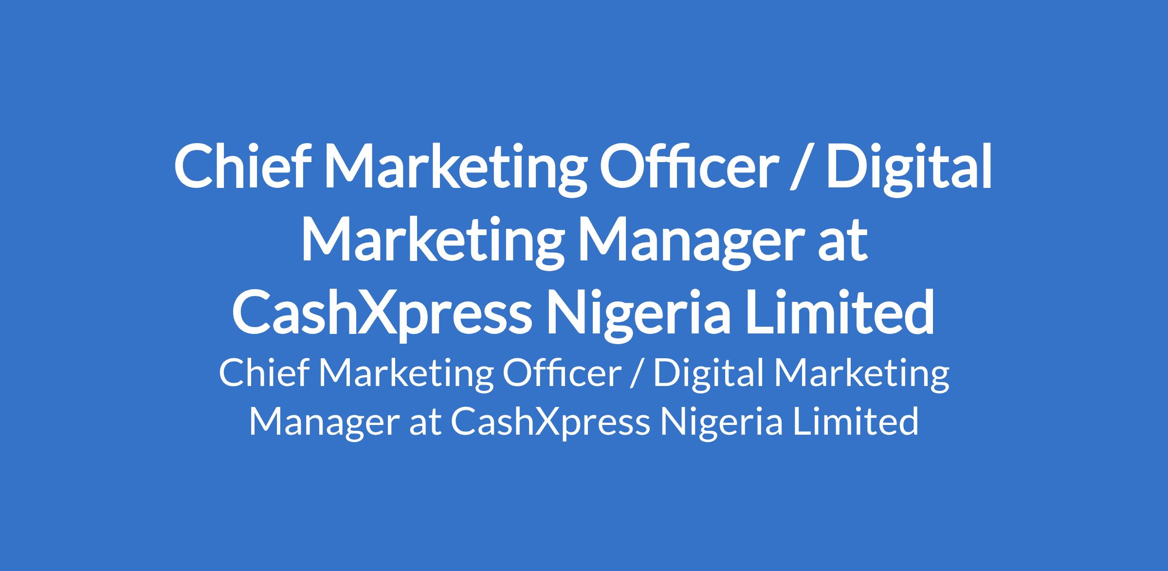 CashXpress Nigeria Limited is recruiting to fill the position of: Chief Marketing Officer / Digital Marketing Manager. The position is located in Lagos State. Interested candidates should possess a Bachelors Degree; MBA or advanced Marketing / Finance qualification is preferred; with proven experience in fintech / digital lending marketing, growth, or business development in Nigeria.
