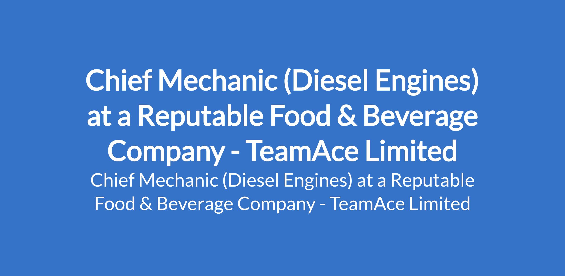 TeamAce Limited - Our client, a reputable organization in the Food & Beverage sector is recruiting to fill the position of: Chief Mechanic (Diesel Engines). The position is located in Apapa, Lagos State. Salary: N200,000 - N400,000 per month. Interested candidates should possess minimum of an SSCE or Technical / Vocational certification in Automobile or Diesel Mechanics with a minimum of 4 years experience working with diesel engines and heavy-duty vehicles