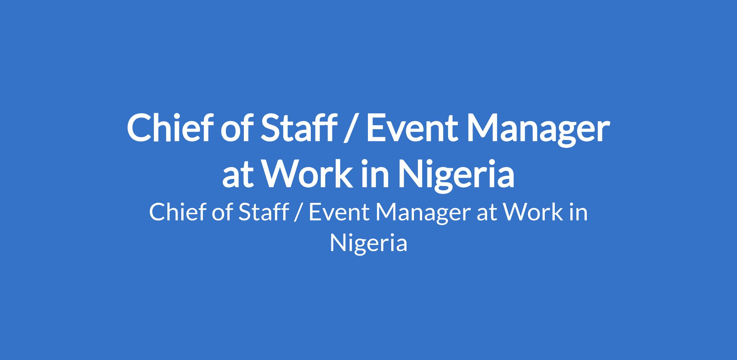 Work in Nigeria is recruiting to fill the position of: Chief of Staff / Event Manager. The position is located in Eti - Osa, Lagos State. Interested candidates should possess a Bachelors Degree in Event Management, Business Administration, or a related field with 3 6 years of experience in event management or a similar role.