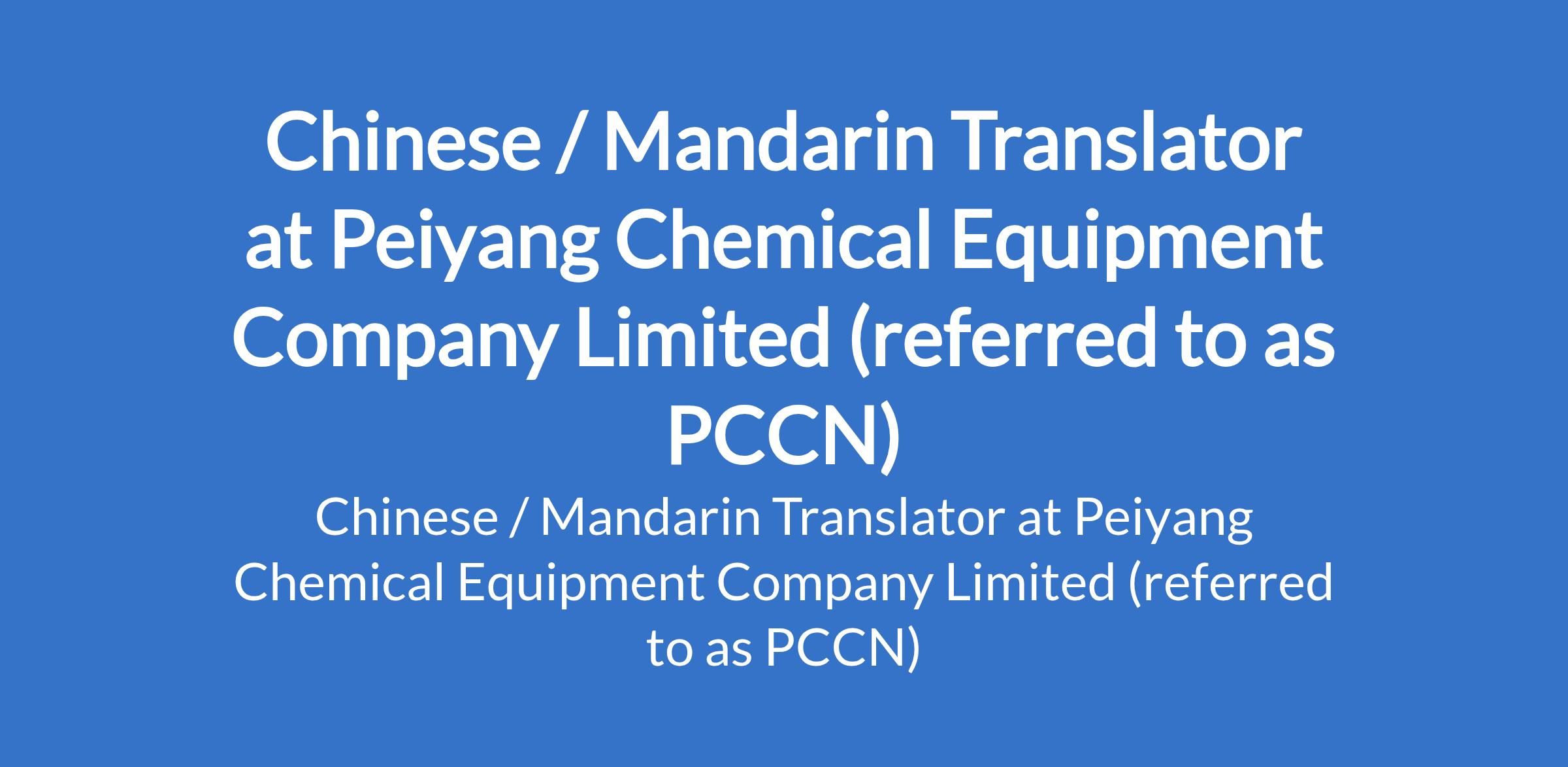 Peiyang Chemical Equipment Company Limited (referred to as PCCN) is recruiting to fill the position of: Chinese / Mandarin Translator. The position is located in Benin City, Edo State. Salary: N500,000 - N750,000 monthly. Interested candidates should possess relevant qualifciations.