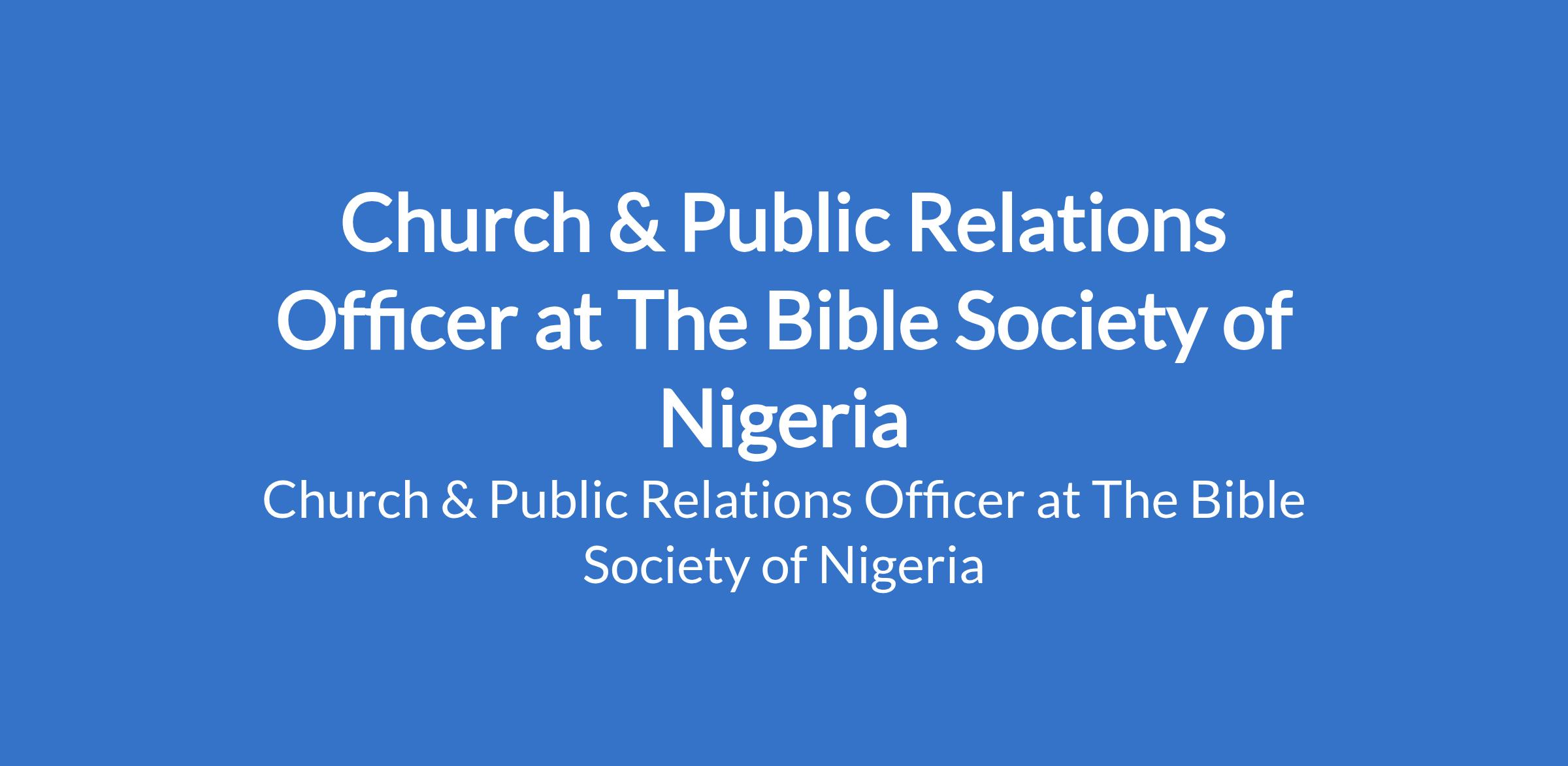 The Bible Society of Nigeria is recruiting to fill the position of: Church & Public Relations Officer. The position is located in Mainland, Lagos State. Interested candidates should possess a B.Sc / HND in Mass Communication, Public Relations, Journalism, Marketing or related field of study with a minimum of three (3) years of working experience in marketing/sales or business development.