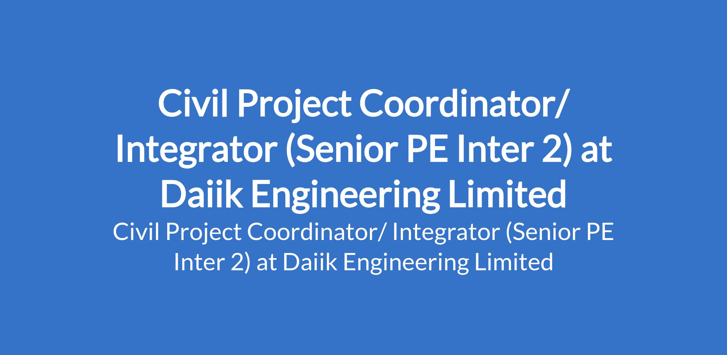 Daiik Engineering Limited is recruiting to fill the position of: Civil Project Coordinator / Integrator (Senior PE Inter 2). The position is located in Port Harcourt, Rivers State. Interested candidates should possess a B.Sc Degree in Civil Engineering with over 20 years experience in oil and gas industry.