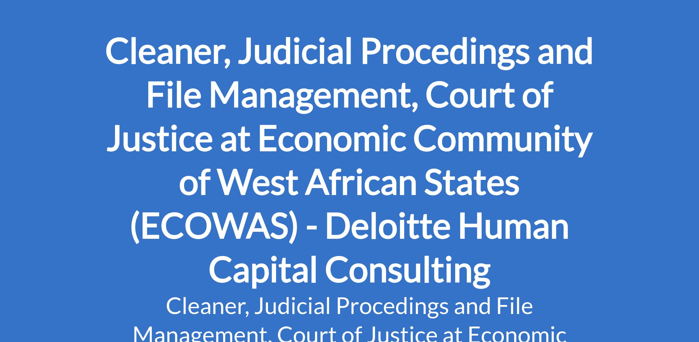Deloitte Human Capital Consulting - Our client, Economic Community of West African States (ECOWAS) is recruiting to fill the position of: Cleaner, Judicial Procedings and File Management. The position is located in Abuja. Salary: UAC 66,123.98 / USD 104,330.42 annually. Interested candidates should possess a Masters Degree in Law or equivalent obtained from a recognized university with 10 years of experience in increasingly high leadership positions in the field of administrative law or related fields, including 2 years of relevant international experience and 2 years in a supervisory position.