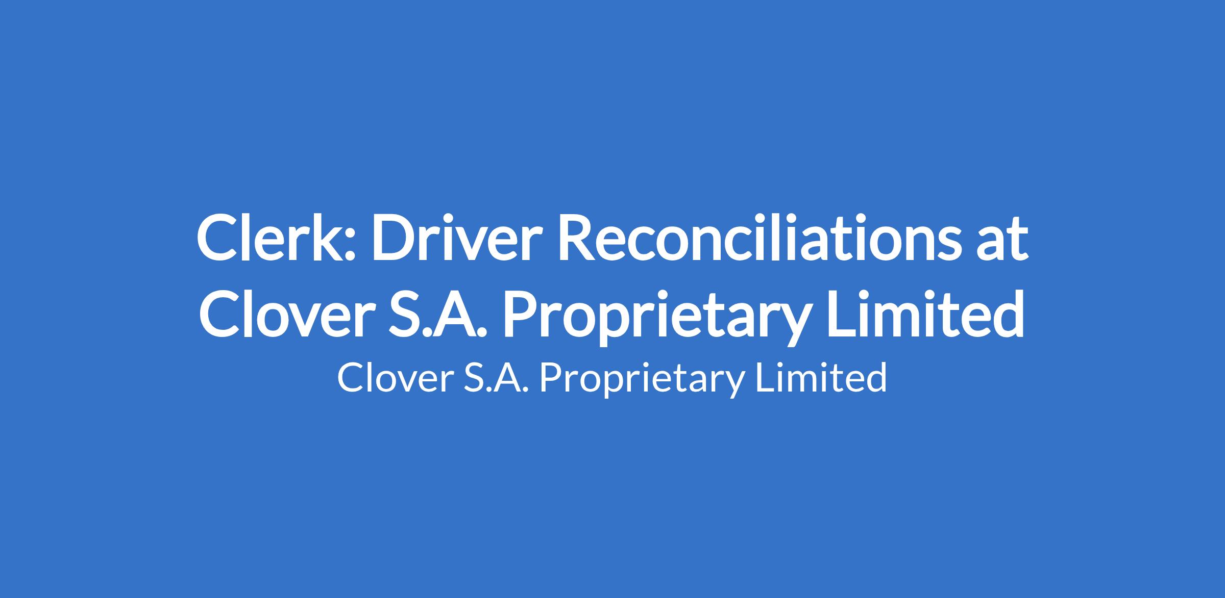 To reconcile Driver documentation received after a delivery round has been completed and capture data in Clover ERM. Duties will include recon of driver's daily routes, processing of cash, EFT and cashless payments from drivers, resolve recon issues and discrepancies, system and admin processing, support the debrief / transport function. The Clerk: Driver Reconciliation ensures that what left the depot, what was delivered, what came back, and what was paid all balance — every single day