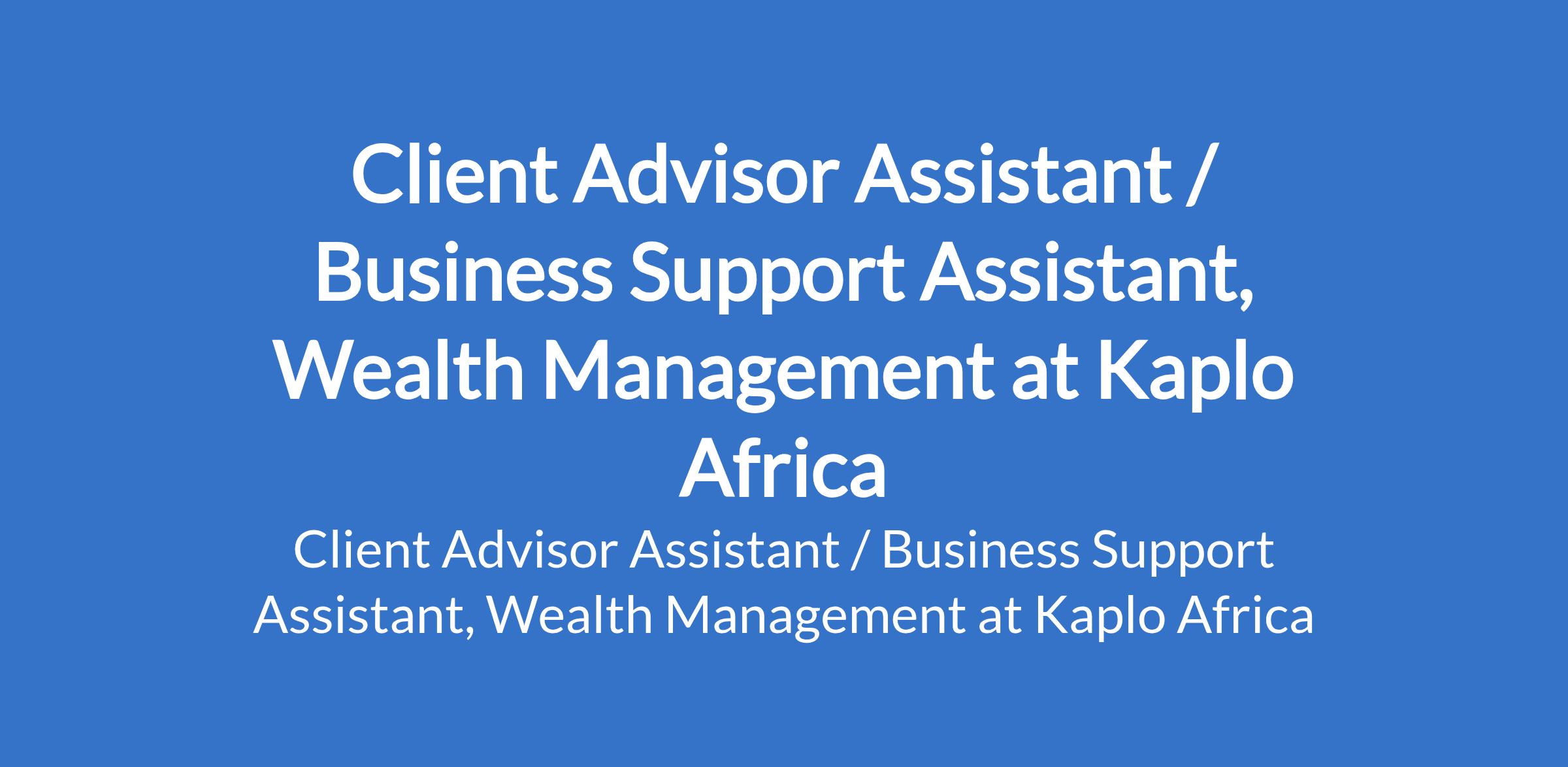 Kaplo Africa is recruiting to fill the position of: Client Advisor Assistant / Business Support Assistant, Wealth Management. The position is located in Lagos State. Interested candidates should possess a B.Sc Degree in Finance, Economics, Accounting, Business or related fields with 1 4 years of experience in wealth management, private banking, asset management, family office, or financial services.
