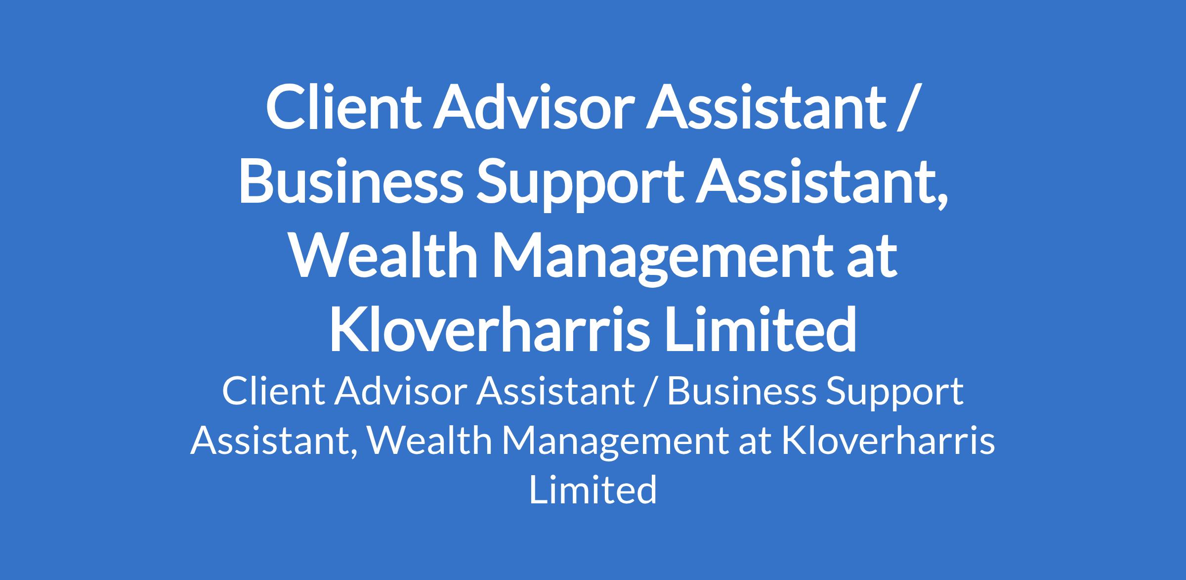 Kloverharris Limited is recruiting to fill the position of: Client Advisor Assistant / Business Support Assistant, Wealth Management. The position is located in Ikoyi, Lagos State. Interested candidates should possess a B.Sc Degree in Finance, Economics, Accounting, Business or related fields with 1 4 years experience in wealth management, private banking, asset management, family office, or financial services.