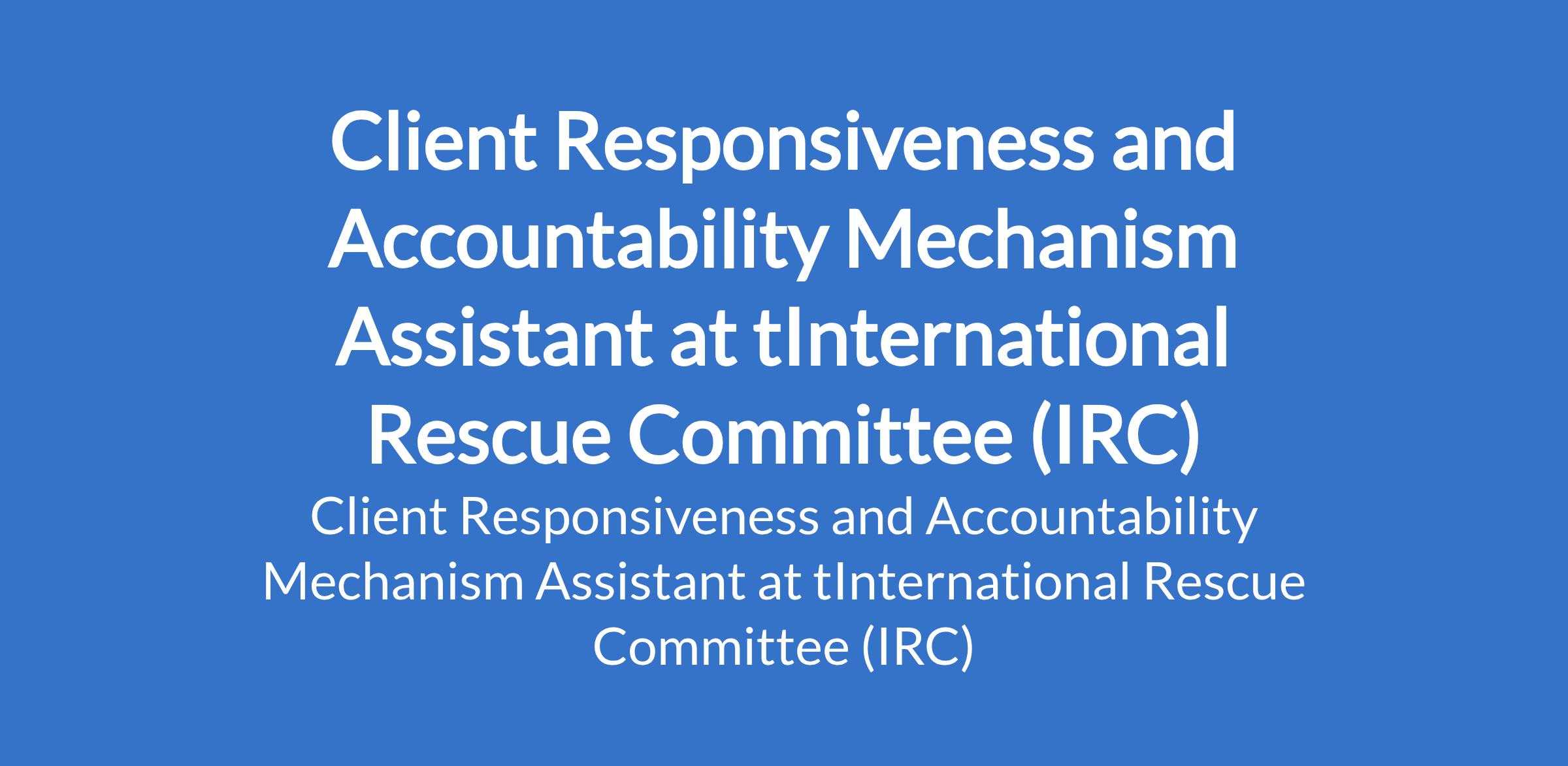 The International Rescue Committee (IRC) is recruiting to fill the position of: Client Responsiveness and Accountability Mechanism Assistant. The position is located in Maiduguri, Borno State. Interested candidates should possess minimum of a Diploma in Communication or related fields with at least one year experience handling complaint response mechanisms.