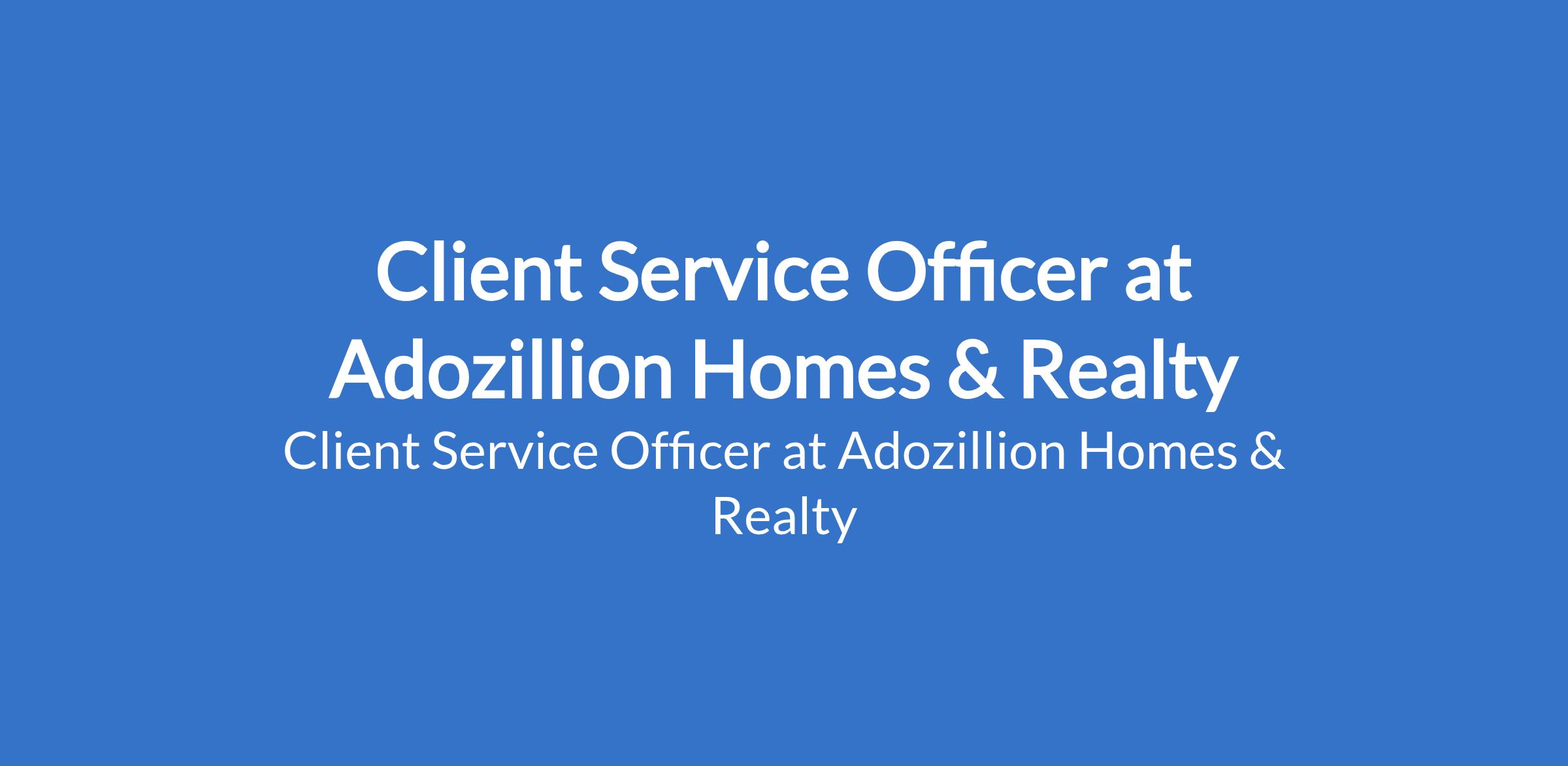 Adozillion Homes & Realty is recruiting to fill the position of: Client Service Officer. The position is located in Lekki Phase 1, Lagos State. Interested candidates should possess a B.Sc / HND in a related field with a minimum of 2 years of front-facing experience.
