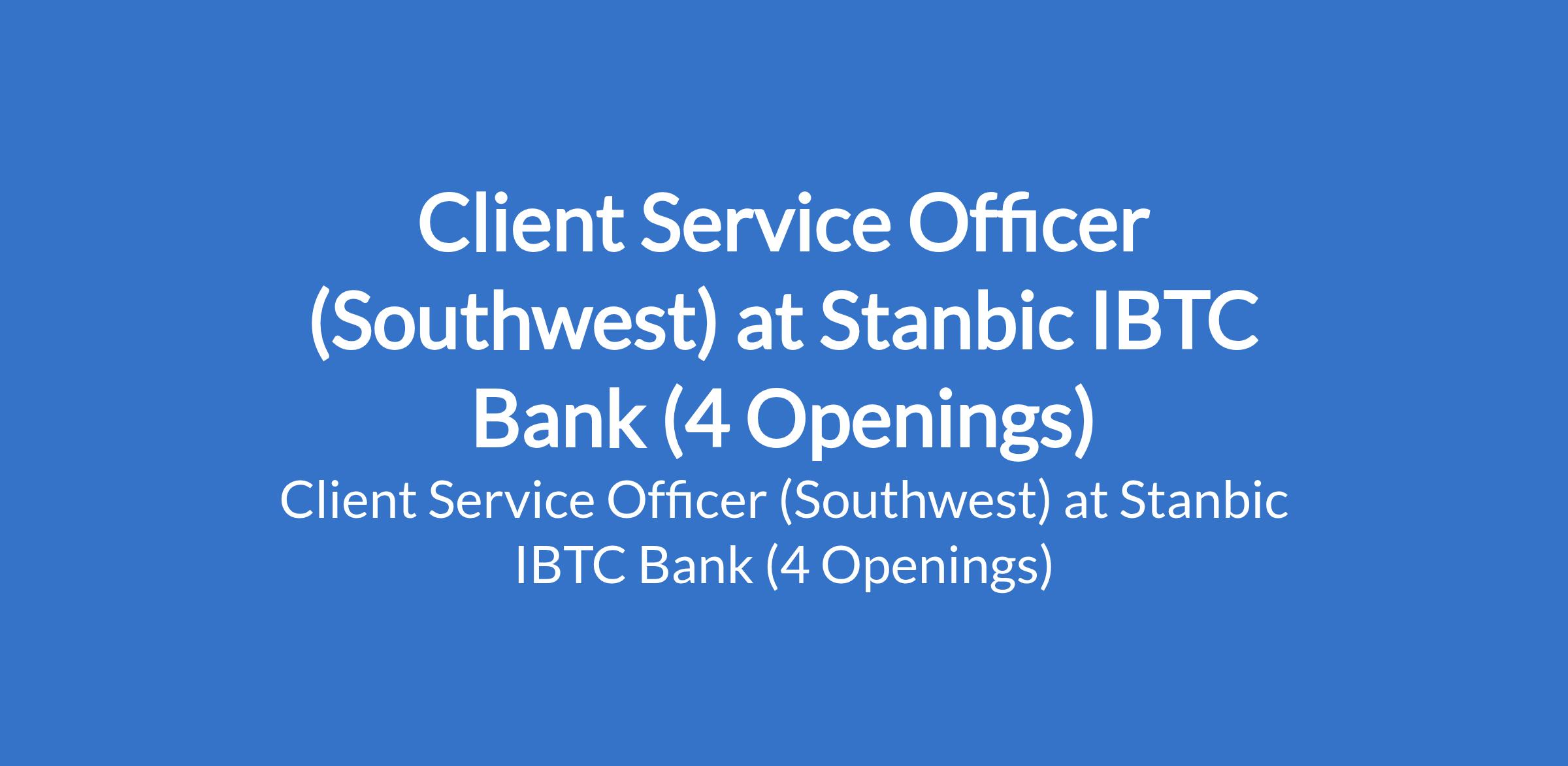 Stanbic IBTC Bank is recruiting to fill the position of: Client Service Officer (Southwest). The position is located in Osun, Ekiti, Ondo and Ogun States. Interested candidates should possess minimum of First Degree with 1 - 2 years of experience with the banks products, compliance procedures, and regulations governing financial services management.