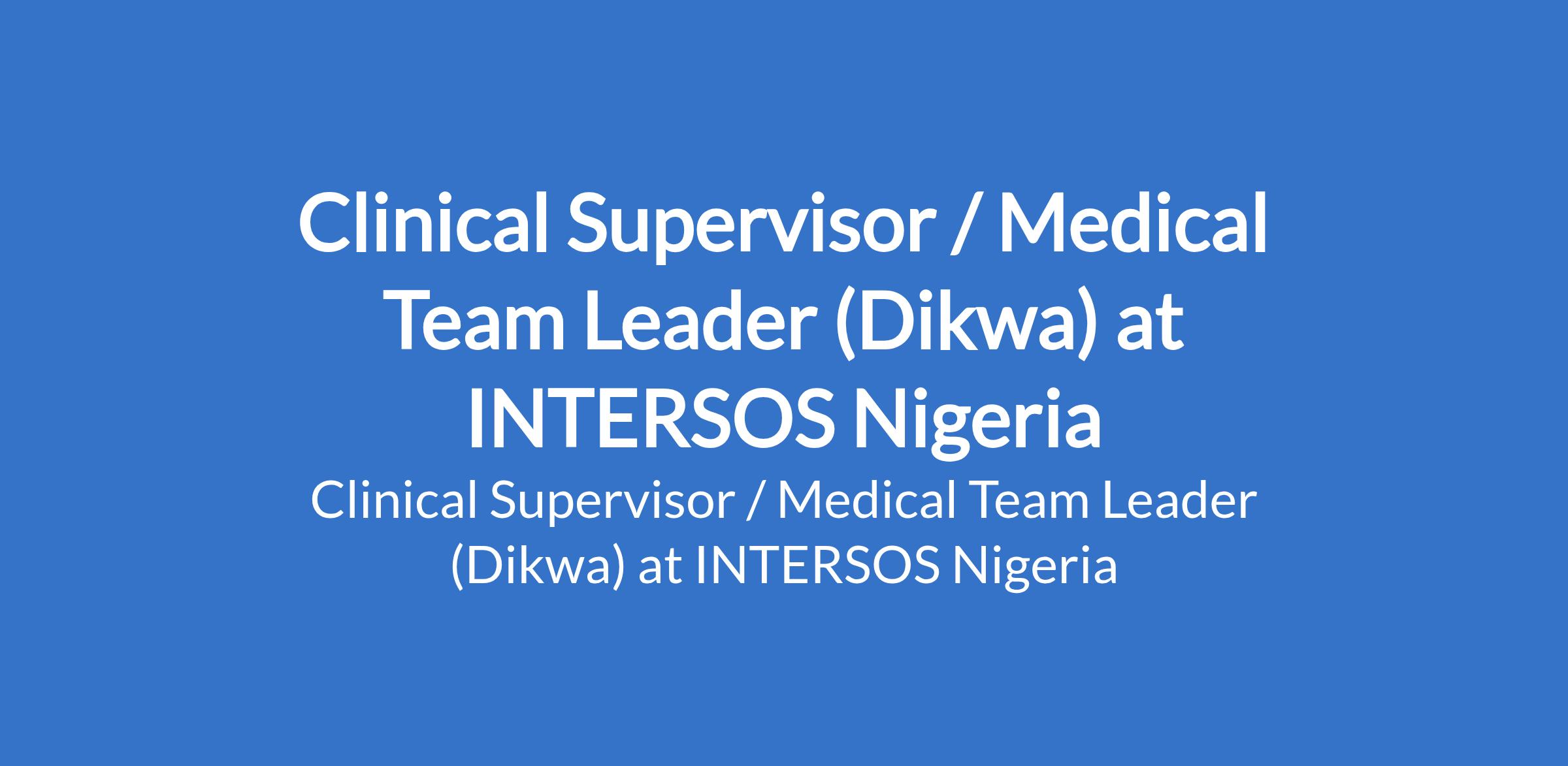 INTERSOS Nigeria is recruiting to fill the position of: Clinical Supervisor / Medical Team Leader. The position is located in Dikwa, Borno State. Interested candidates should possess a Bachelors Degree in Medicine (MBBS / MBChB) with experience in emergency with over 2 years experience in a humanitarian context.