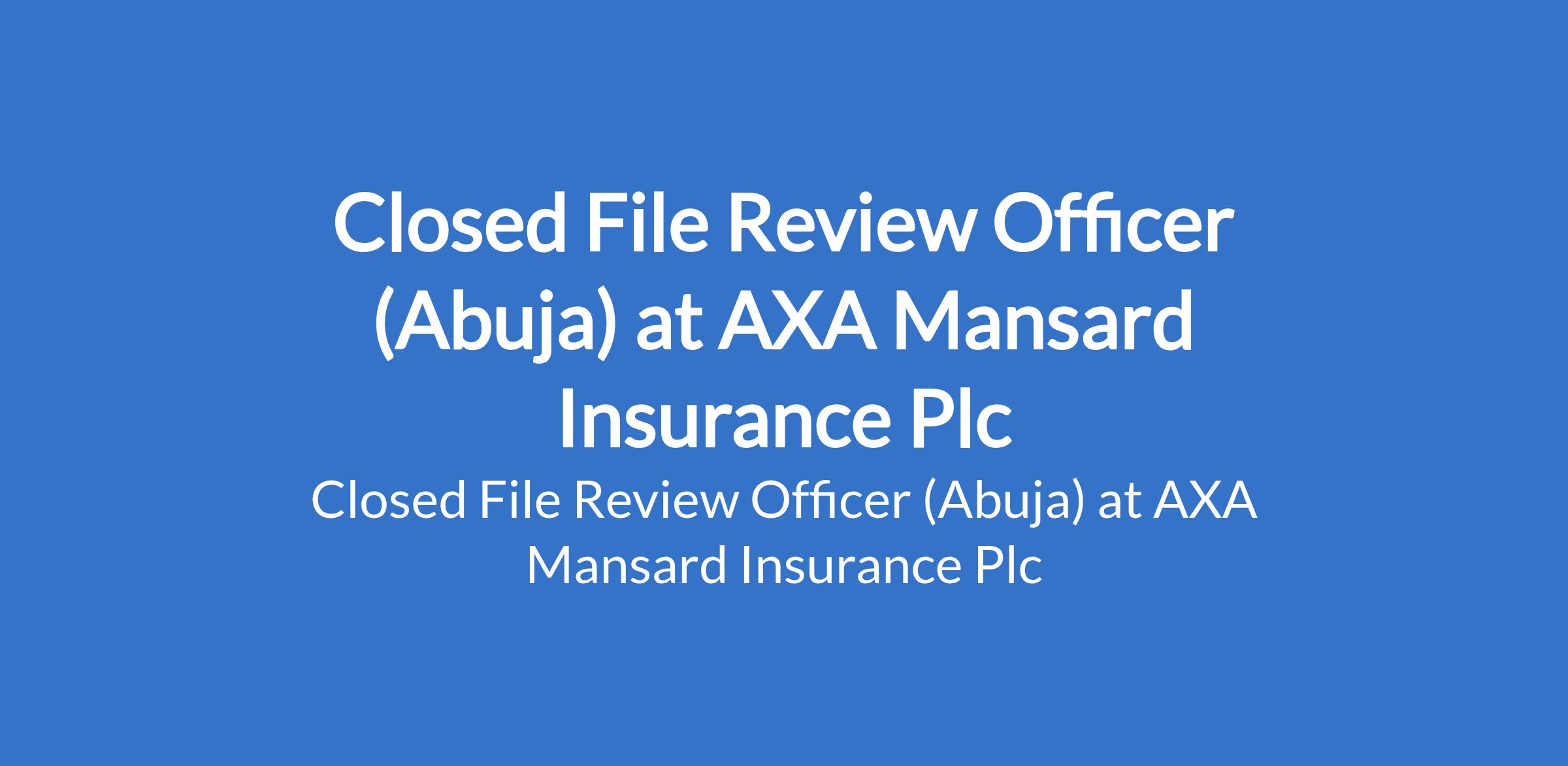 AXA Mansard Insurance Plc is recruiting to fill the position of: Closed File Review Officer. The position is located in Abuja. Interested candidates should possess an MBBS Degree from a reputable Tertiary Institution with 1 - 4 years of experience in claims related.