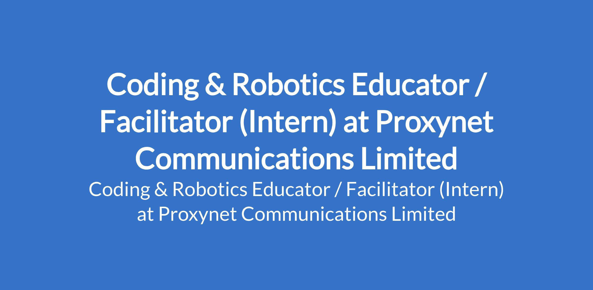 Proxynet Communications Limited is recruiting to fill the position of: Coding & Robotics Educator / Facilitator (Intern). The position is located in Galadima, Gwarinpa Abuja (FCT). Interested candidates should possess relevant qualifications with 0-1 year experience.