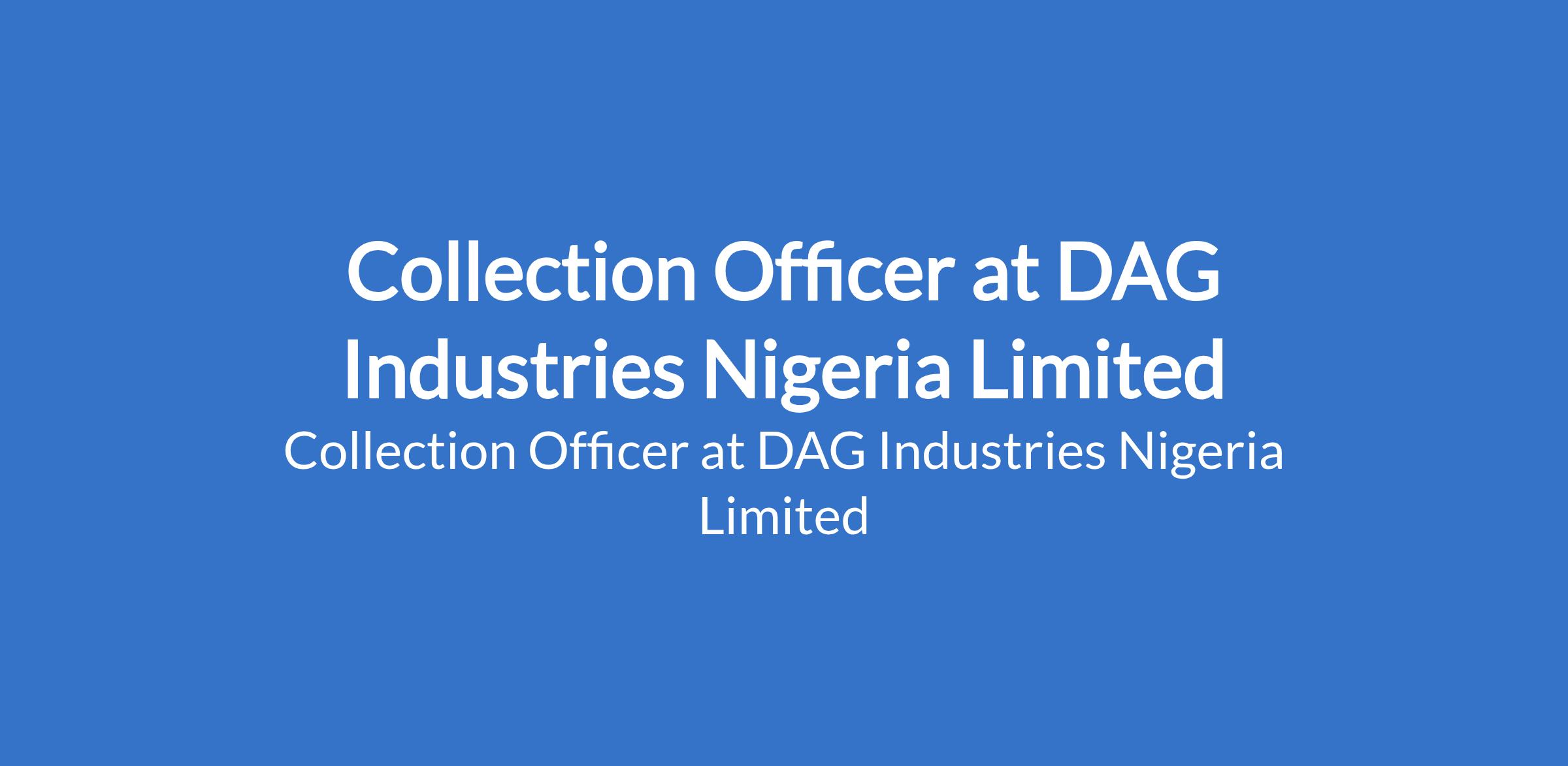 DAG Industries Nigeria Limited is recruiting to fill the position of: Collection Officer. The position is located in Ikeja, Lagos State. Interested candidates should possess a Bachelors Degree or HND in Finance, Accounting, Business Administration, Economics, or related field with 2 8 years experience in collections, credit control, customer service, or related role.