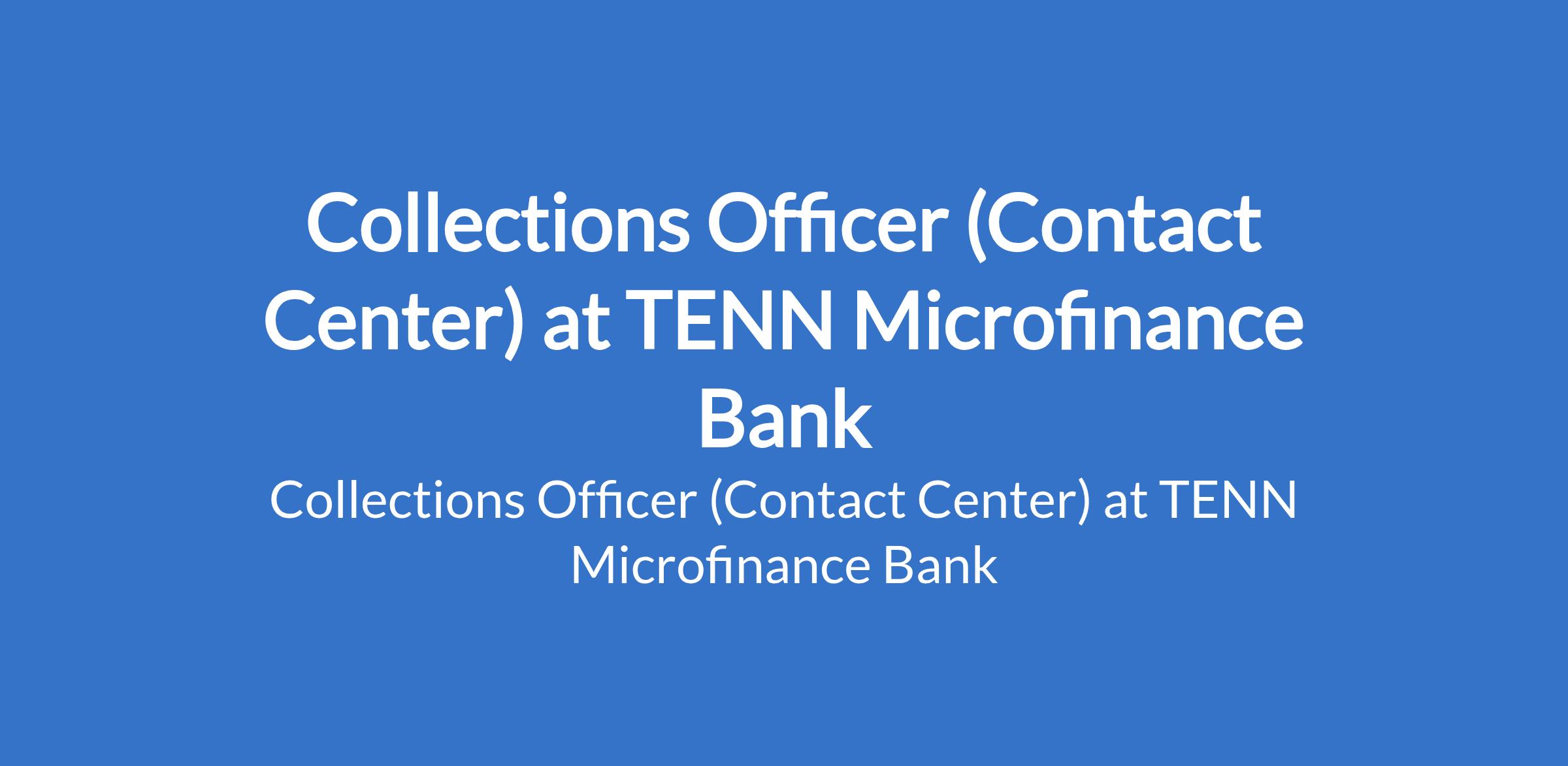 TENN Microfinance Bank is recruiting to fill the position of: Collections Officer (Contact Center). The position is located in Lagos State. Salary: N100,000 - N220,000 monthly. Interested candidates should possess a minimum of SSCE/ OND / NCE / HND / B.Sc in any relevant field with 1 - 2 years of relevant work experience.