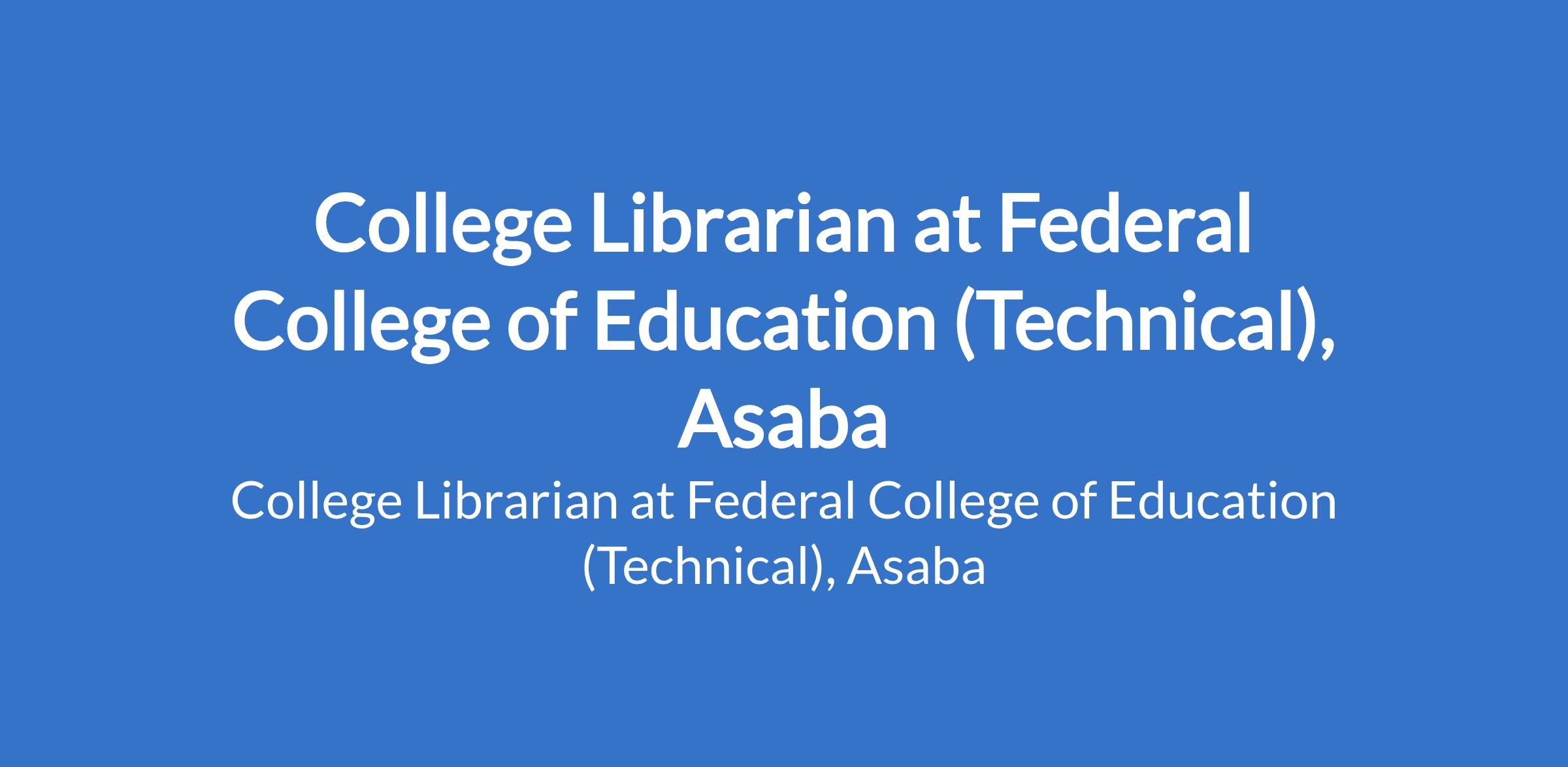 Federal College of Education (Technical), Asaba invites applications from suitable candidates for the position of: College Librarian. The position is located in Delta State. Interested candidates should possess a good Bachelor's Degree with Master's Degree in Library Science (MS) from a recognized institution of higher learning with at least fifteen (15) years cognate experience and registraton with Professional Library Body.