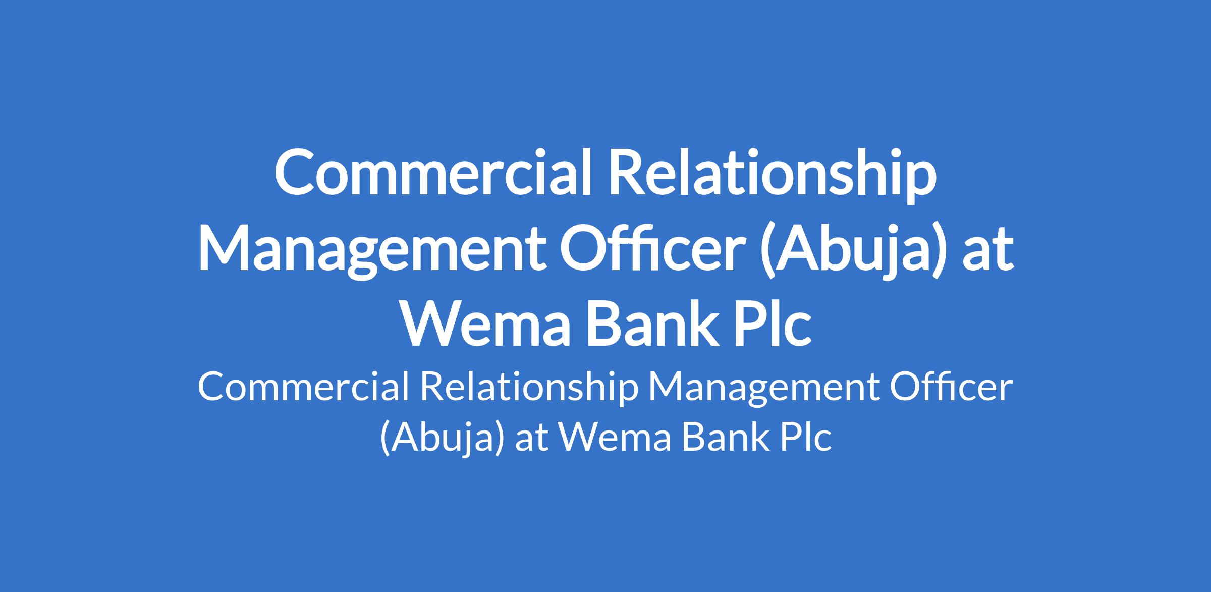 Wema Bank Plc is recruiting to fill the position of: Commercial Relationship Management Officer. The position is located in Abuja. Interested candidates should possess a minimum of a First Degree in any discipline, a Professional Certification (CIBN), with 3 - 8 years cognate experience.