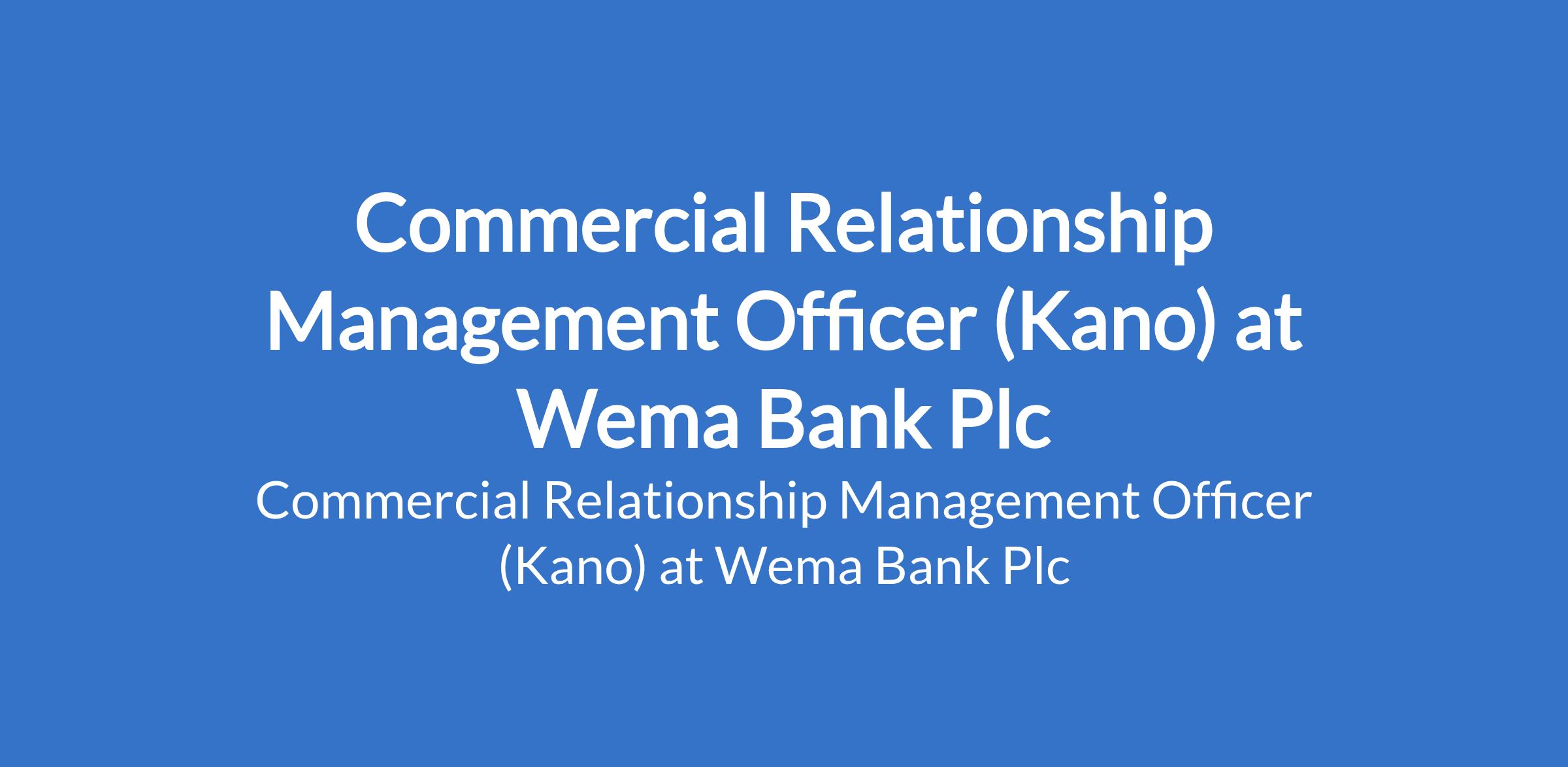 Wema Bank Plc is recruiting to fill the position of: Commercial Relationship Management Officer. The position is located in Kano State. Interested candidates should possess minimum of a First Degree in any discipline, a Professional Certification (CIBN), with 3 - 8 years cognate experience.