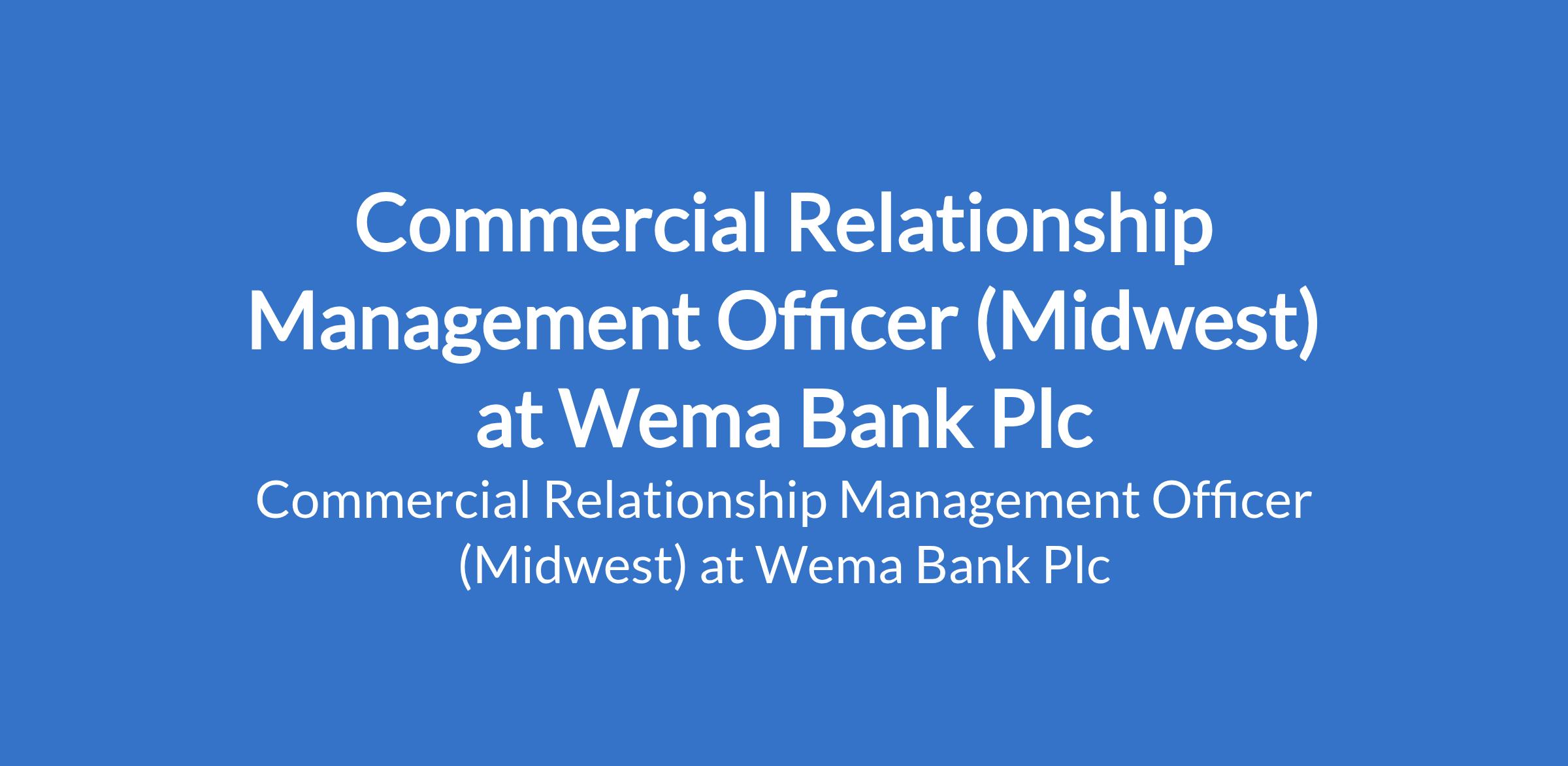 Wema Bank Plc is recruiting to fill the position of: Commercial Relationship Management Officer. The position is located in the Midwestern region of Nigeria. Interested candidates should possess minimum of a First Degree in any discipline, a Professional Certification (CIBN), with 3 - 8 years cognate experience.