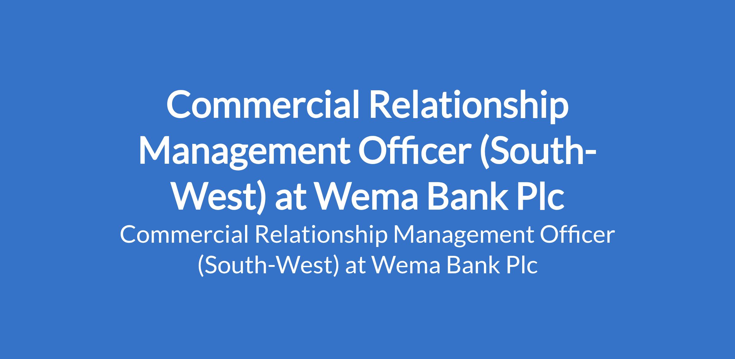 Wema Bank Plc is recruiting to fill the position of: Commercial Relationship Management Officer. The position is located in the South-Western region of Nigeria. Interested candidates should possess a minimum of a First Degree in any discipline, a Professional Certification (CIBN), with 3 - 8 years cognate experience.