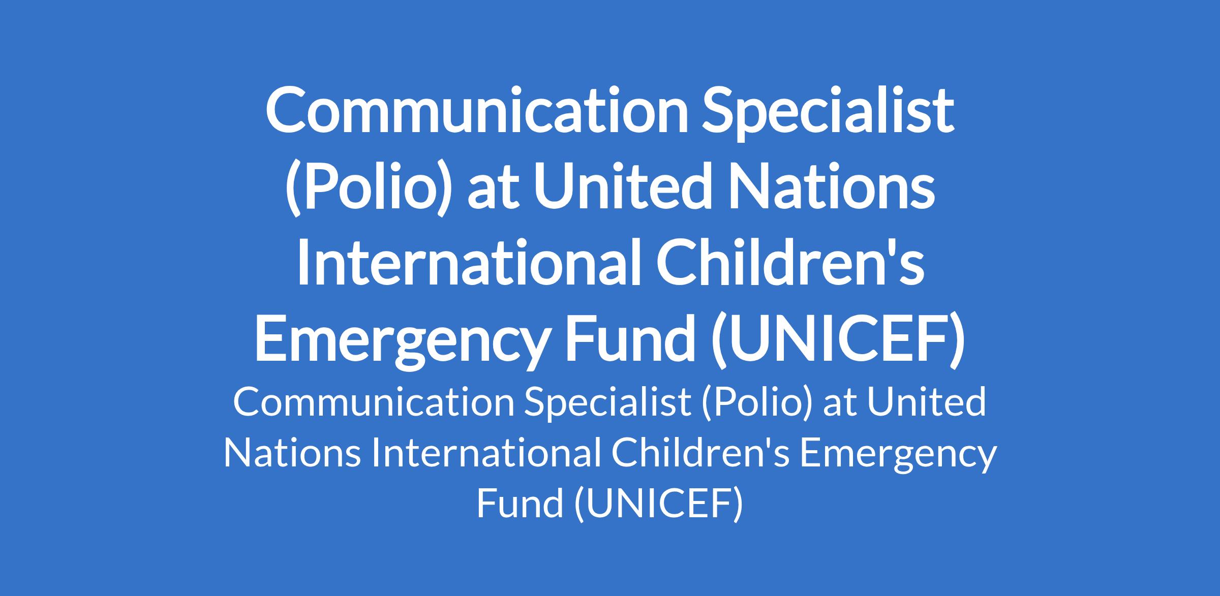 United Nations International Children's Emergency Fund (UNICEF) is recruiting to fill the position of: Communication Specialist (Polio). The position is located in Abuja. Interested candidates should possess an Advanced University Degree in Communication, Journalism, Public Relations, Public Health, or related fields with five years of progressively responsible professional experience in communications, public relations, advocacy, or media; Alternatively, a First University Degree with at least 7 years of relevant professional experience in communications, journalism, advocacy, or public affairs.