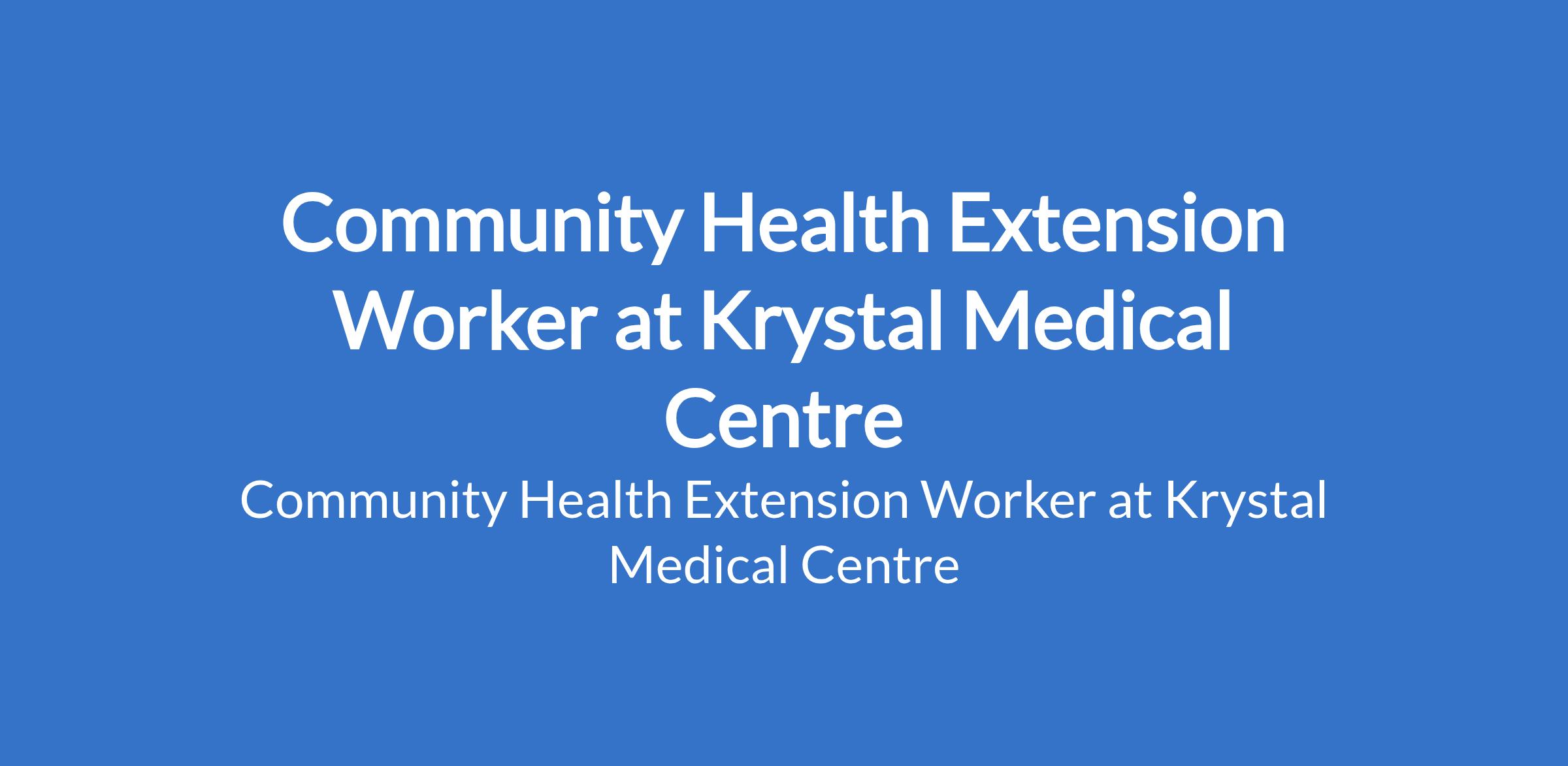 Krystal Medical Centre is recruiting to fill the position of: Community Health Extension Worker. The position is located in Ikeja, Lagos State. Salary: N80,000 per month. Interested candidates should possess a recognized CHEW qualification and registration with the appropriate regulatory body with valid practicing license and a minimum of two (2) years relevant work experience.