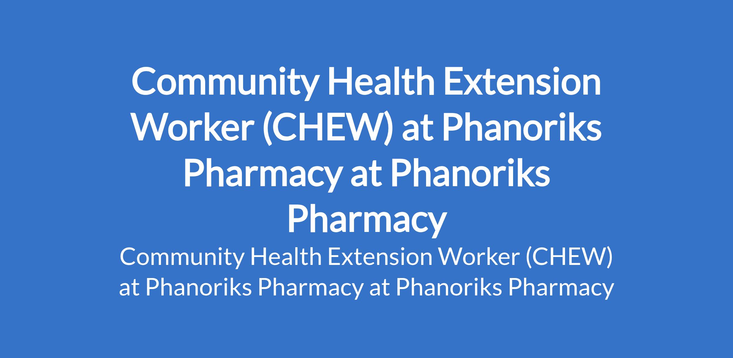 Phanoriks Pharmacy is recruiting to fill the position of: Community Health Extension Worker (CHEW) at Phanoriks Pharmacy. The position is located in Abuja (FCT). Salary: N60,000 - N100,000 / month. Interested candidates must hold a Community Health Extension Workers (CHEW) Diploma from an accredited institution.