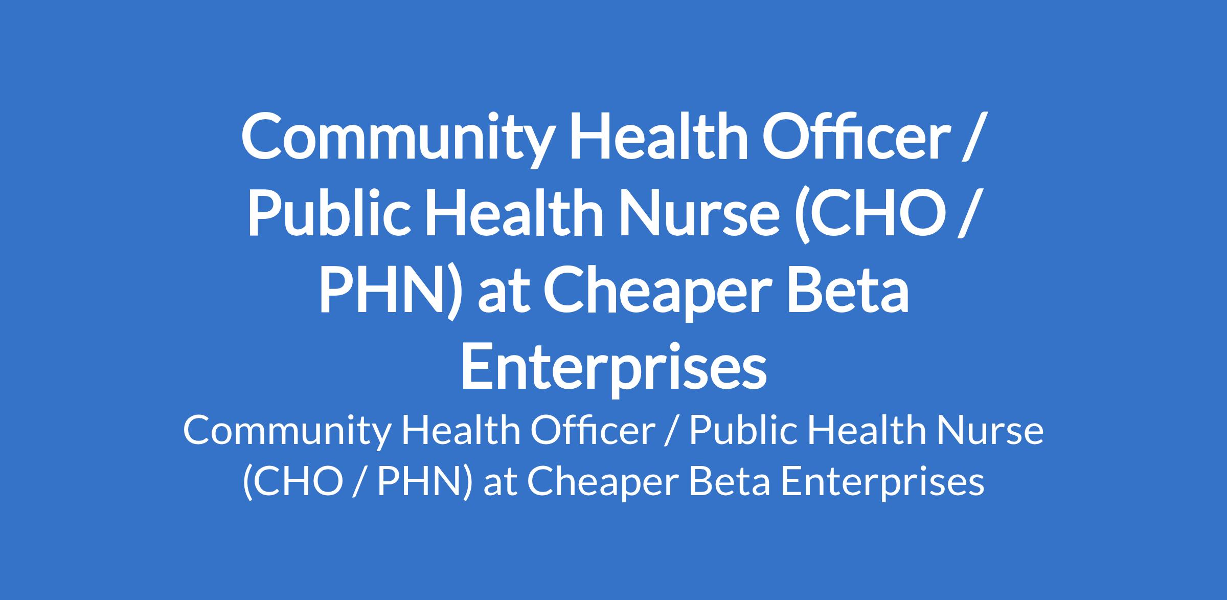 Cheaper Beta Enterprises is recruiting to fill the position of: Community Health Officer / Public Health Nurse (CHO / PHN). The position is located in Ado-Ekiti, Ekiti State. Salary: N85,000 - N90,000 monthly. Interested candidates should possess an HND/BSc in Community Health with CHPRBN registration (for the CHO role) or RN/RM plus post-basic Public Health Nursing qualification with NMCN registration (for the PHN role).