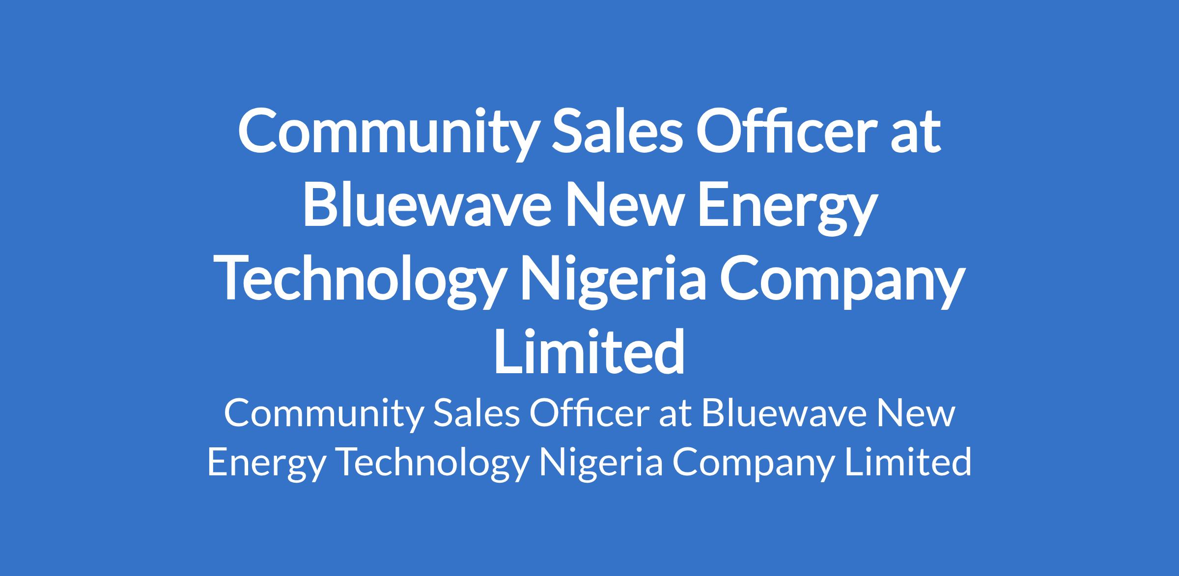 Bluewave New Energy Technology Nigeria Company Limited is recruiting to fill the position of: Community Sales Officer. The position is located in Ikeja, Lagos State. Salary: N150,000 - N300,000 monthly. Interested candidates should possess an OND / HND / B.Sc Degree (Fresh graduates welcome).